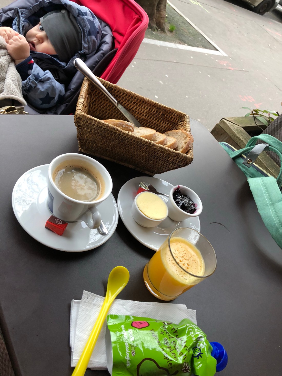 Runt PdP och in mot centrum igen var mysiga små gator och fullt med caféer. Så frukost ”un petit déjeuner” för mig och mellis för Sam på första bästa ställe👌🏻