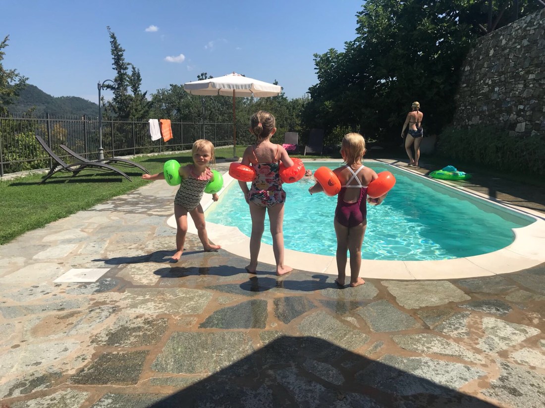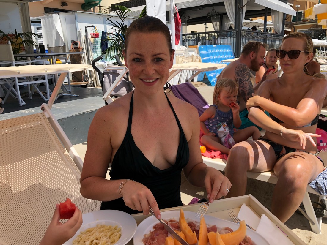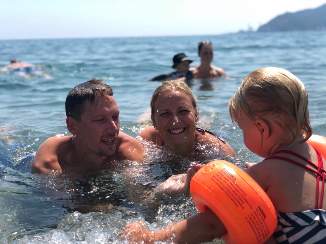 GÄrdagen spenderades vid havet i Alassio. HÀr Àr mycket av strÀnderna privatÀgt vilket gör att man mÄste hyra solstolar och parasoll (för en dyr peng) för att fÄ tillgÄng till vattnet. Nu kÀnns ju parasoll och stolar rÀtt nödvÀndigt ÀndÄ eftersom vi har fyra barn med och det Àr otroligt varmt. Men att bada Àr livet, det tycker just nu hela denna skaran.