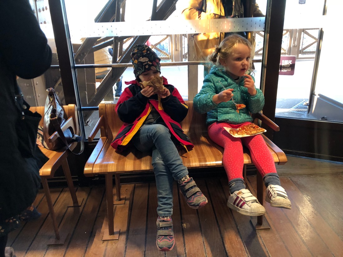 Med 4 barn och dessutom barnvagn var det inget snack om huruvida vi skulle ta hissen eller trapporna. Men det är alltså högt det där tornet. Totalt 324 m, men högsta våningen man kommer upp till är ca 280 m. Det var häftigare än vad jag trodde. Det blev många timmar där uppe, inklusive sovstund för Sam och fika modell större.