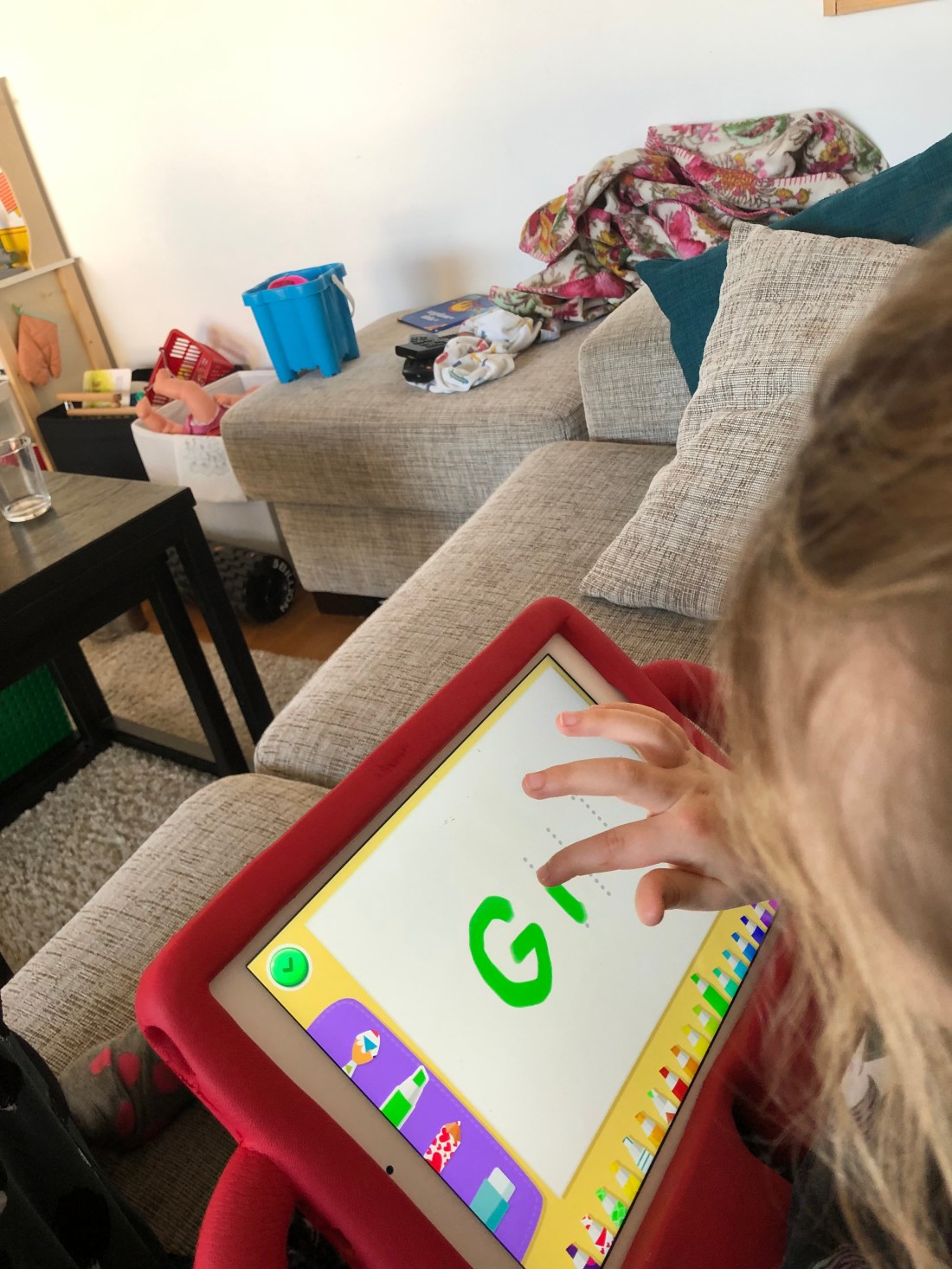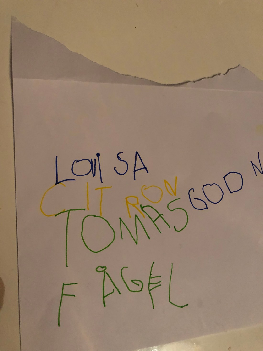I veckan som gått har det här med bokstäver verkligen börjat lossna för Lollo. De jobbar mycket med det i skolan och hon tycker det är jättekul att öva på att skriva. Här t ex en övning där Tomas först skriver något och Lollo gör efter