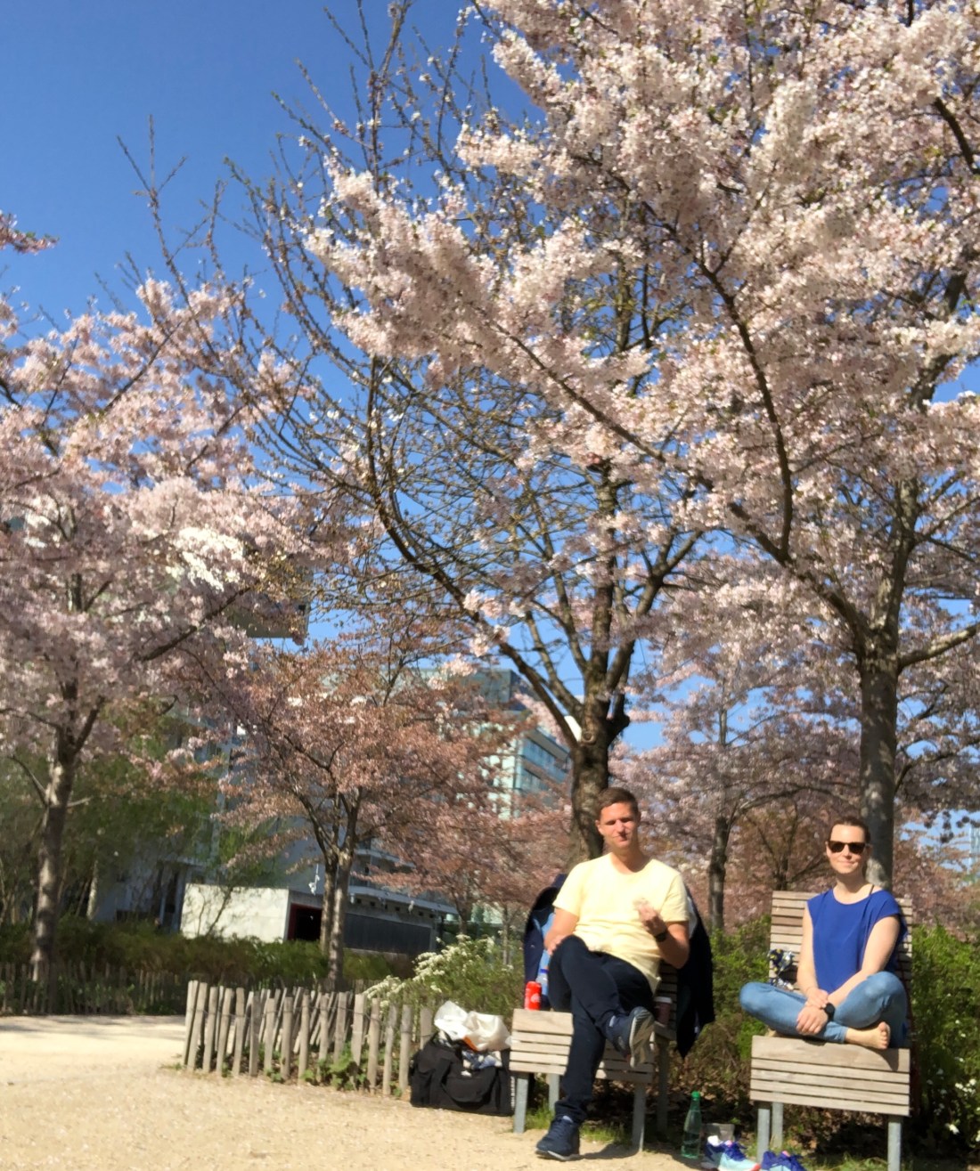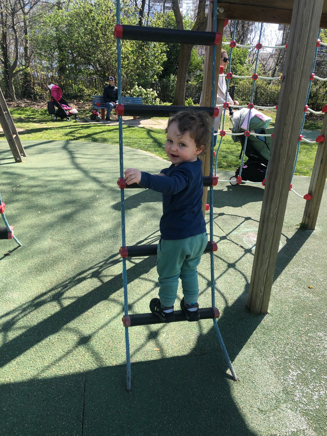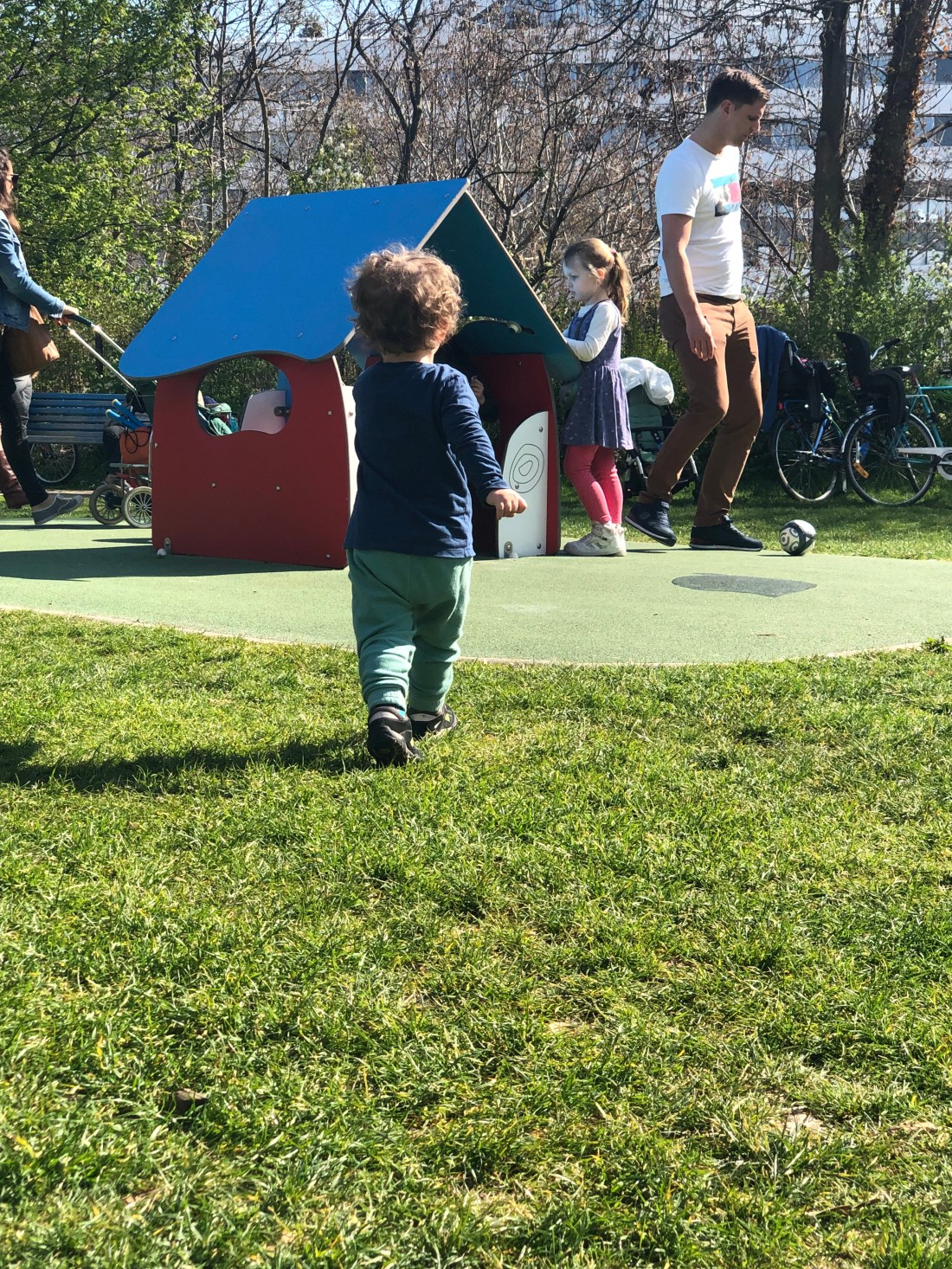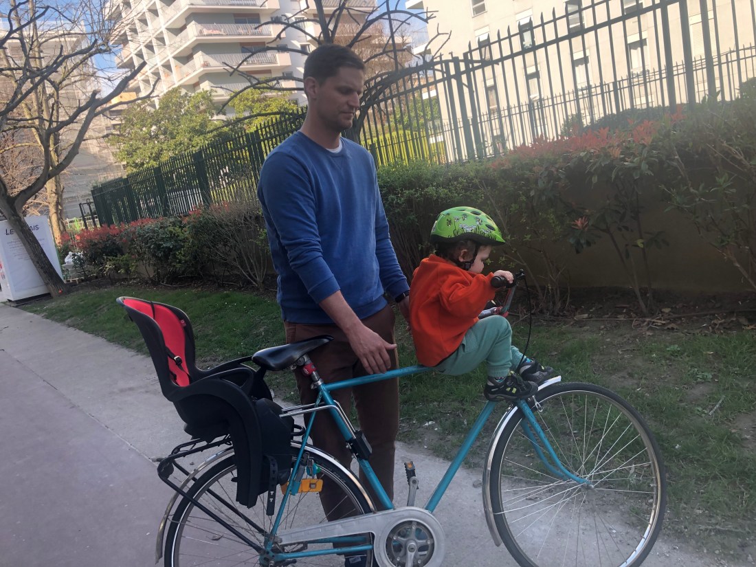 Det har stundtals varit över 20 grader, och gassande sol på det. Såå underbart. Och så enkelt att göra roliga saker. Igår tog vi t ex cyklarna till en park på en av öarna i Seine, Ile St Germain. Här finns, bland annat, den lekplatsen vi hamnade på, där det är gräs. Det är ganska ovanligt. Ofta är det ju grus eller asfalt. Men kändes liksom extra somrigt då.