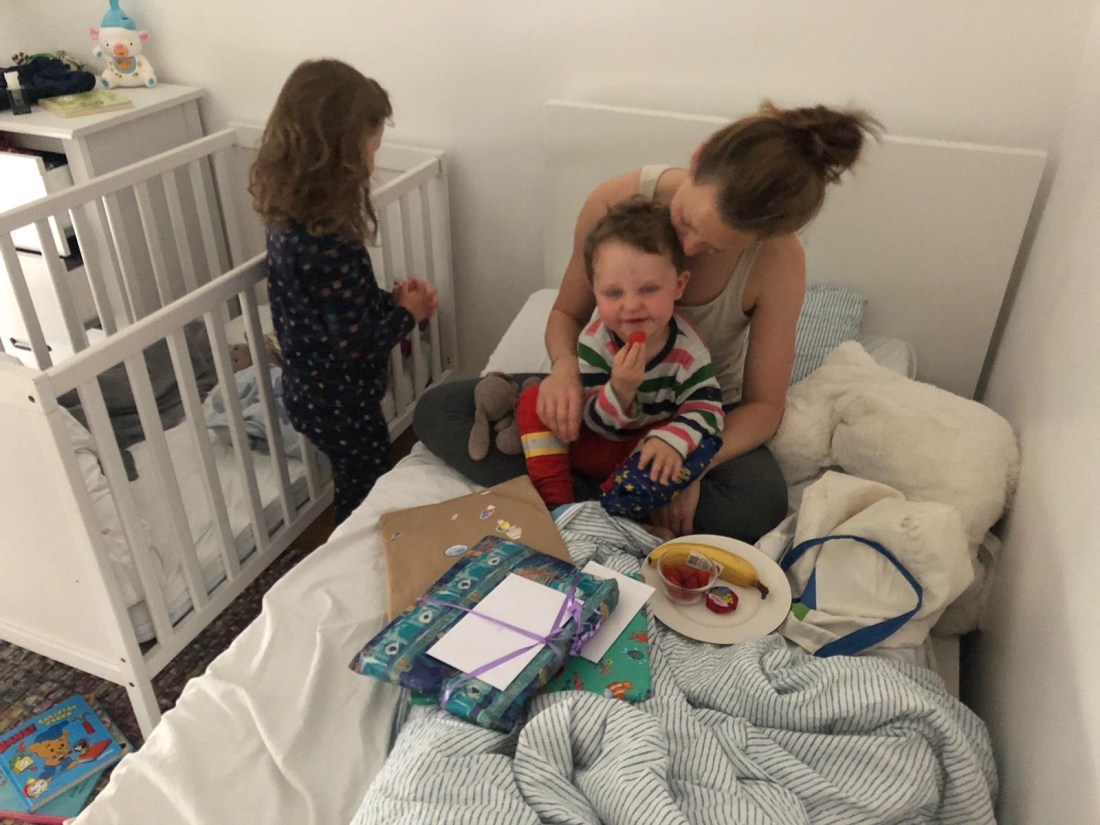 Men tillbaka till födelsedagen. Det började, enligt traditionen, med frukost på sängen. Sam mer intresserad av maten än av presenterna.