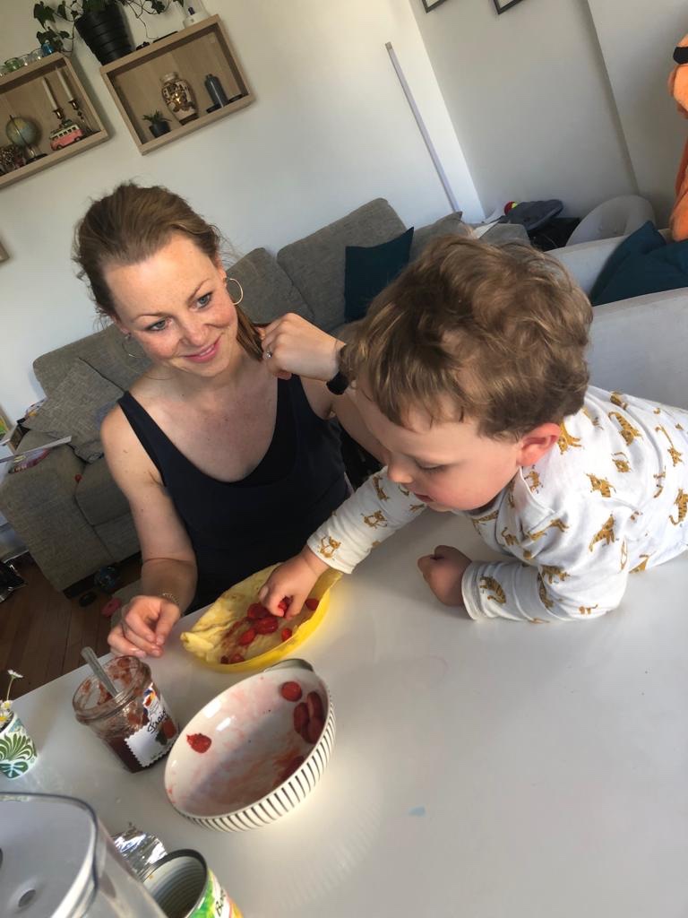 Välkomstkommittén här hemma gick inte av för hackor heller. Två supermysiga barn som bjöd på fina Kramer, och så nyplockade jordgubbar med pannkakor🙌🏻