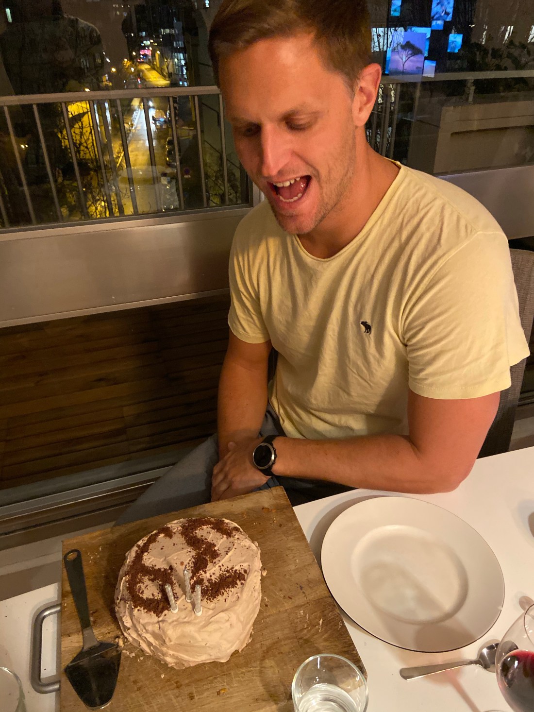 Idag (fredag 31/1) är det Tomas födelsedag men eftersom jag åker bort över helgen så firade vi detta lite igår istället. De där bottnarna som Sam hjälpte till att baka blev till en randig tårta med smak av choklad, banan och jordnötssmör. Tomas gav den toppbetyg vilket jag är väldigt nöjd med.