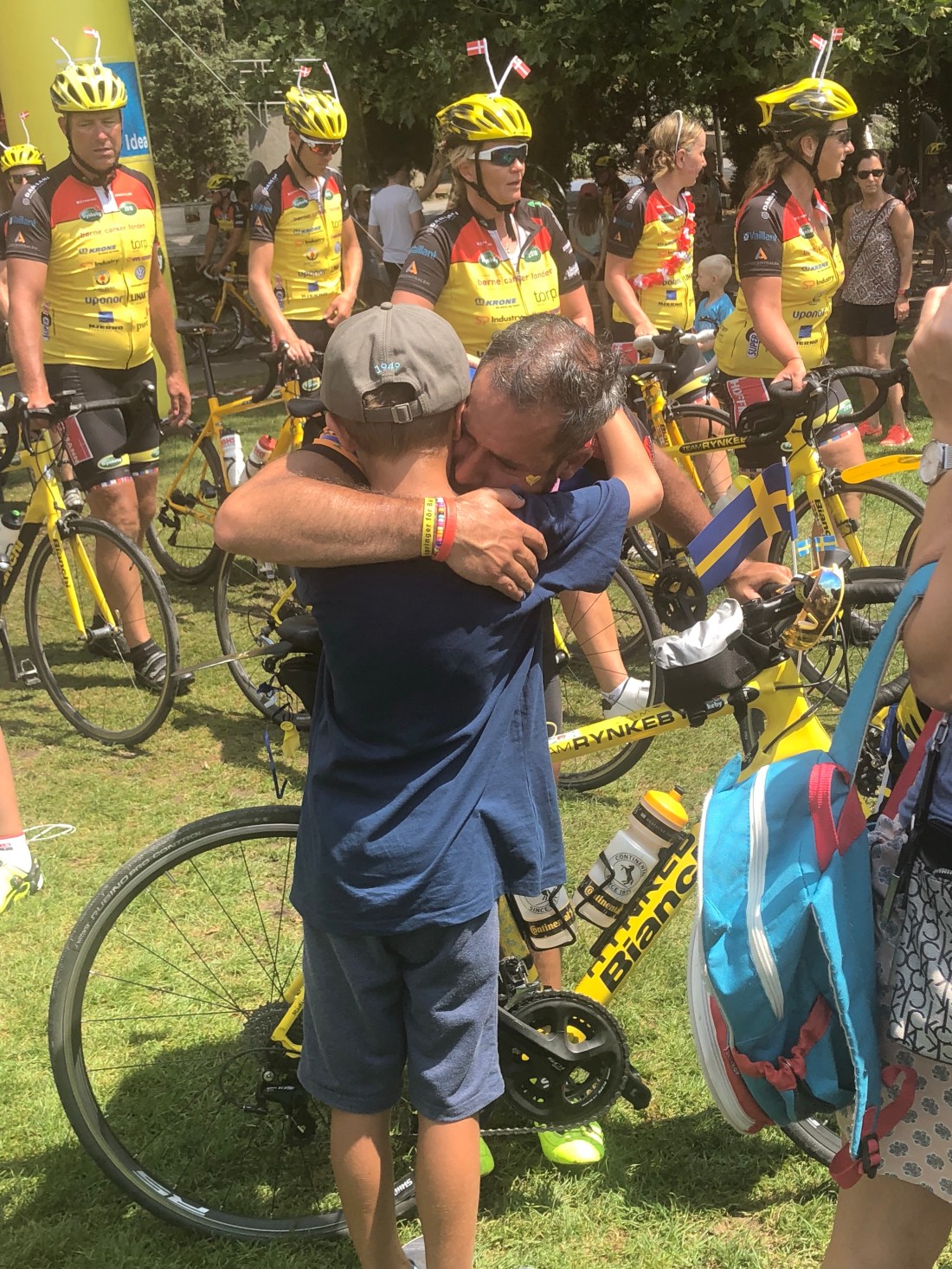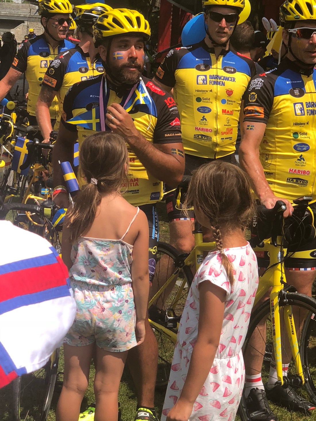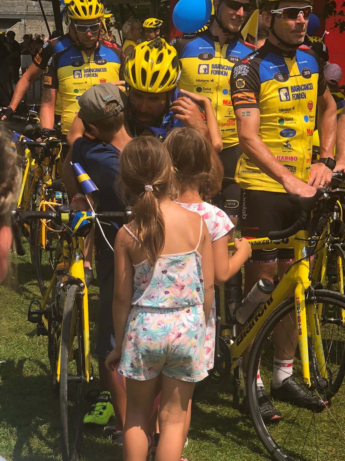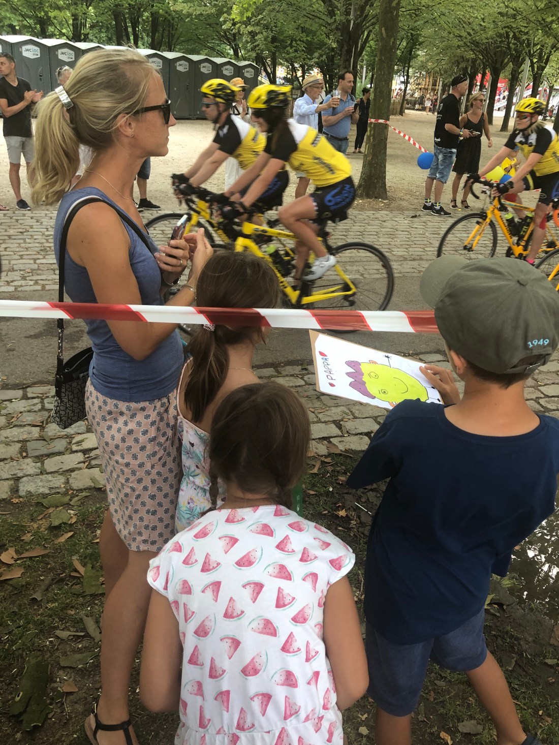 Vi fick alltså besök redan i fredags för att vara redo att ta emot Niklas&co som rullade in i norra Paris på lördagen. Vilket arrangemang alltså! Totalt 1900 cyklister i olika team från hela Norden. Ett stort område var avspärrat och jättefint ordnat i en park i norra Paris. Där blir alla framhejade de sista metrarna och sedan mottagna av familj och vänner efter målgång. Vi väntade mer eller mindre tålmodigt på Helsingborgsteamet😜