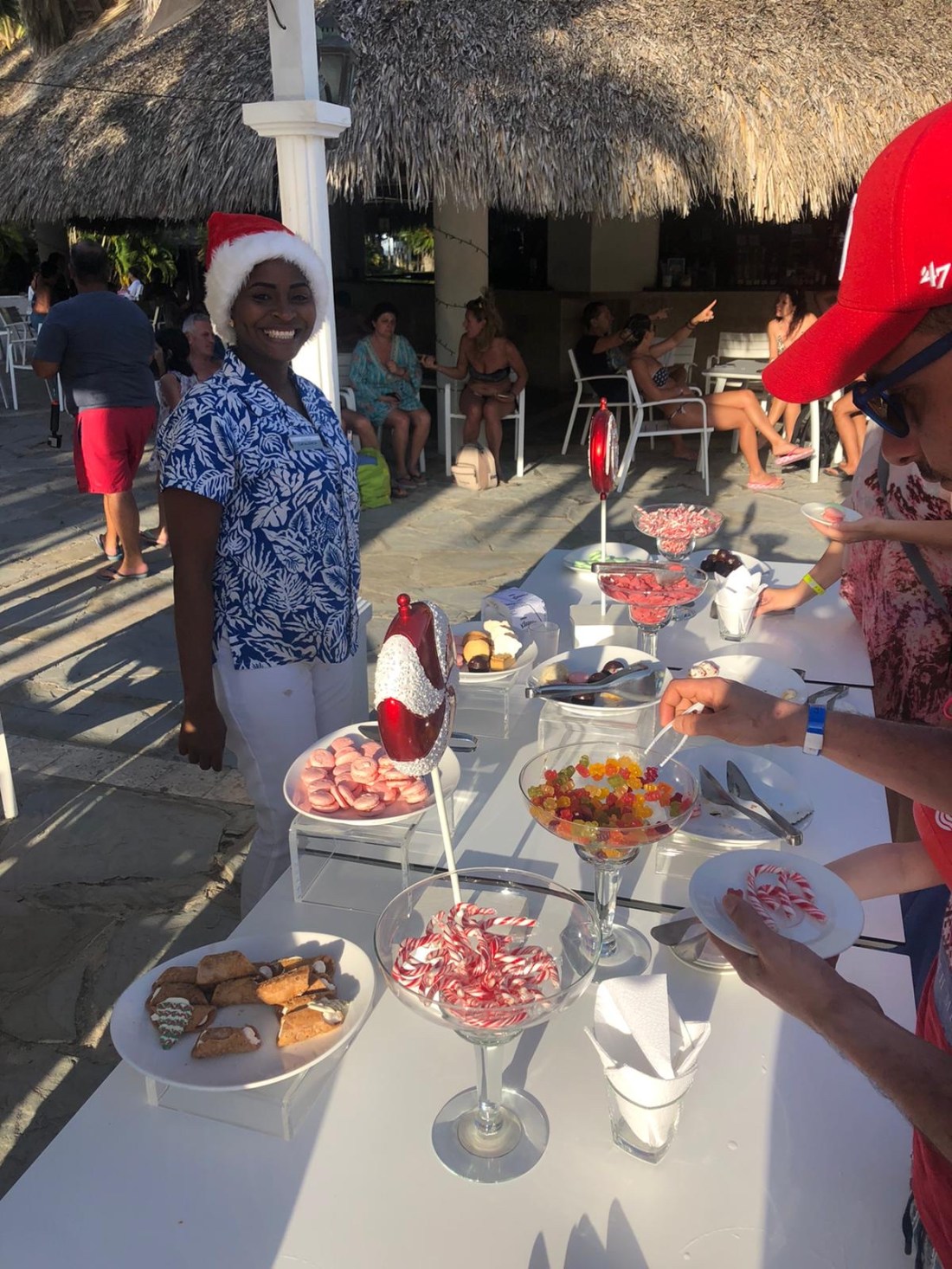 Som ni förstår blir denna jul allt annat än vanlig och traditionsfylld. Men fullproppad av nya fina minnen och upplevelser istället. De gör en del julsaker här på hotellet. Dels speciella julmiddagar, all personal går runt med tomtemössor, det spelas julmusik och så en massa olika happenings både 24 och 25. Idag, 25, väntar vi med spänning på att tomten ska anlända stranden om ungefär en timme. Sedan ska han ta sig upp till hotellet och dela ut julklappar till barnen. Jag&lollo väntar vid poolen med varsin nymixad smoothie, och killarna sover lite middag på rummet.