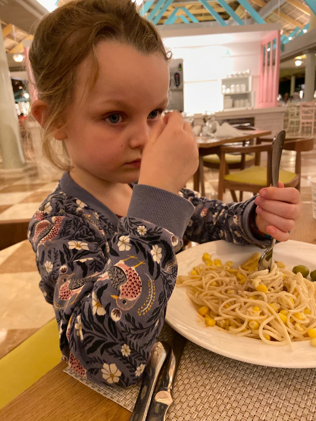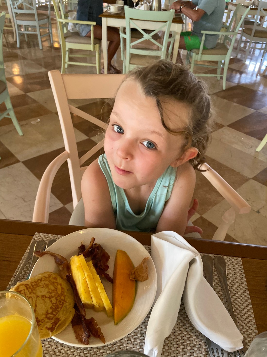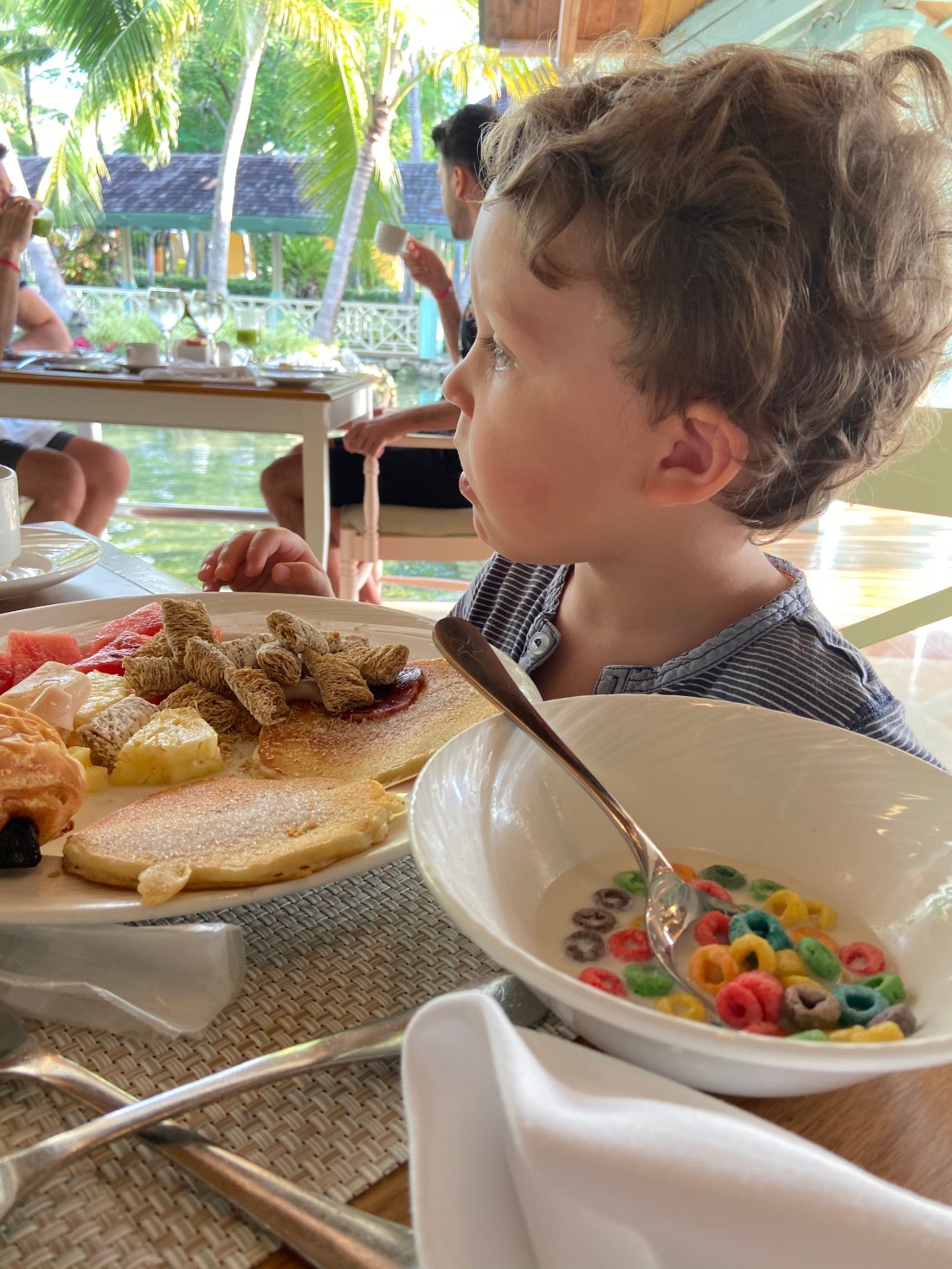 Frukosten i stora restaurangen👆🏻 nästan samma sak har vi ätit varje dag, fast det finns massor att välja på: omelett/stekt ägg och frukt för mig och Tomas, och flingor/pannkakor/frukt för barnen. Och såklart en och annan pannkaka/muffins för de vuxna också😋