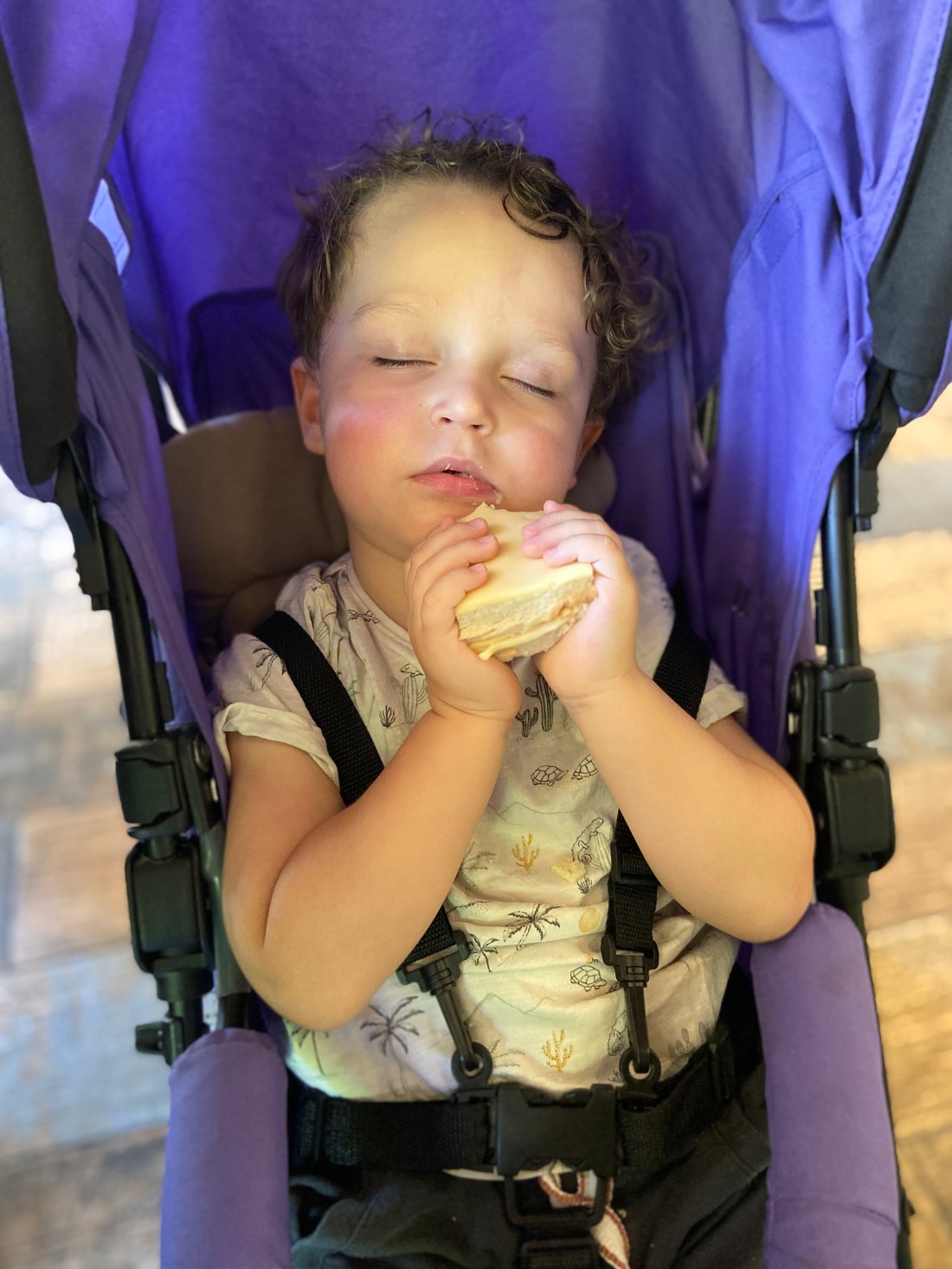 Men det blev inte många tuggor på den mackan, Sam somnade med en otuggad tugga i munnen och mackan i högsta hugg. Man kan liksom verkligen se hur trött den här lilla plutten var.