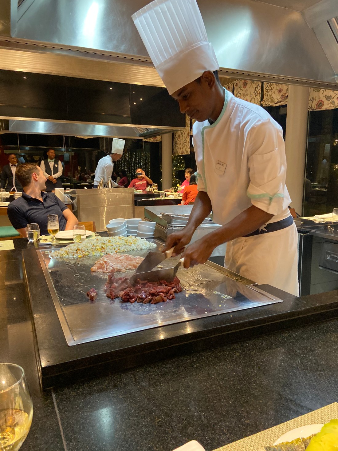 På det här hotellet finns en hel uppsjö restauranger så vi har inte ätit på samma ställe en enda gång. Kvällens middag var nog den godaste hittills – den japanska. Och de körde hela köret med en kock som står i mitten och lagar till hela bordet samtidigt. Med lite show och skojiga trix under tiden.