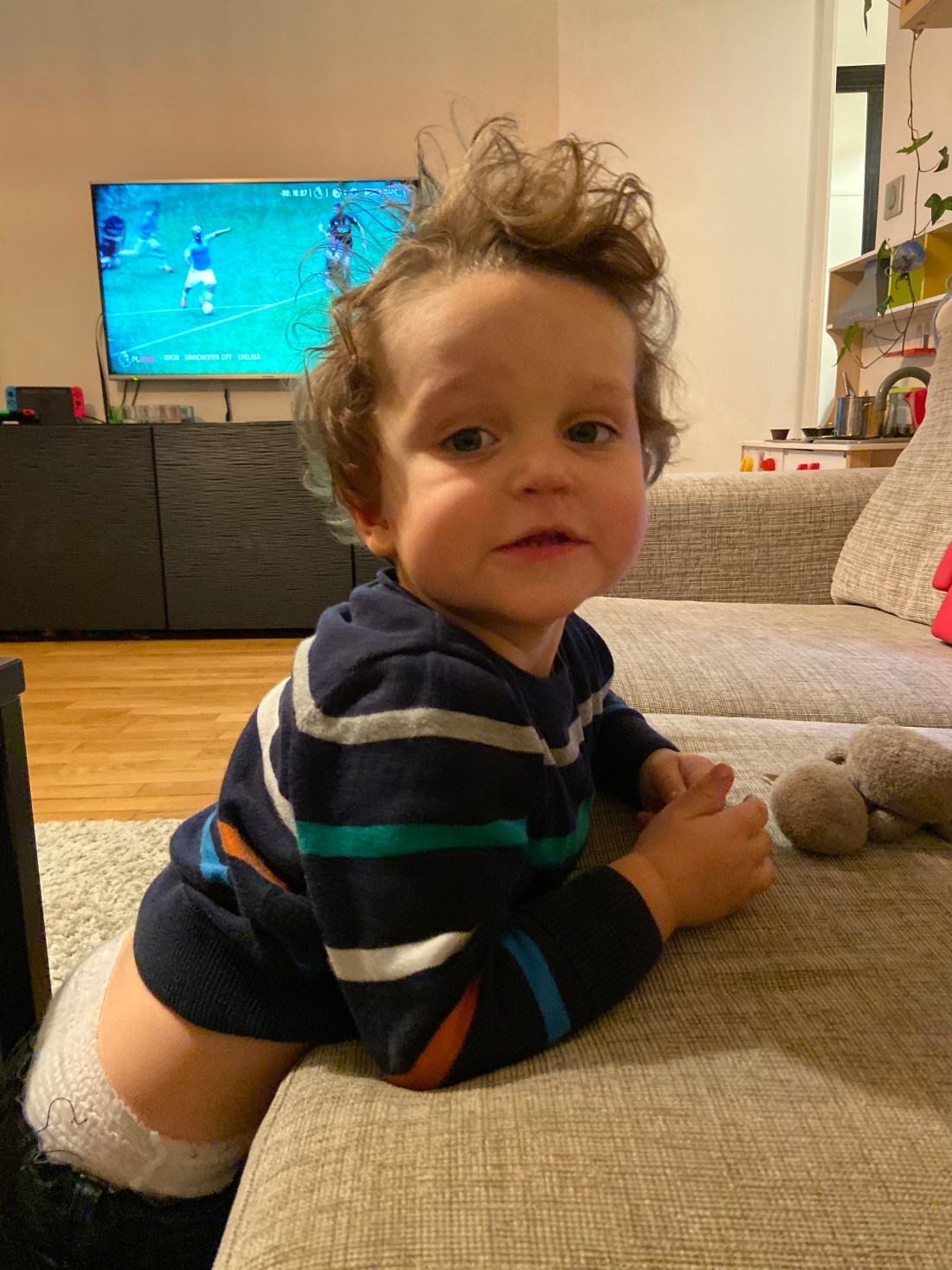 Igår hade vi matchen (Liverpool-City) på i bakgrunden och jag sa till barnen ”där är pappa”, vilket ju var lite korkat eftersom de blev jätteförvirrade. Men Sam sa sin hittills längsta mening, tillsammans med den frågande gesten av två armar ut ”papan pas là”, alltså ”pappa är inte här”.