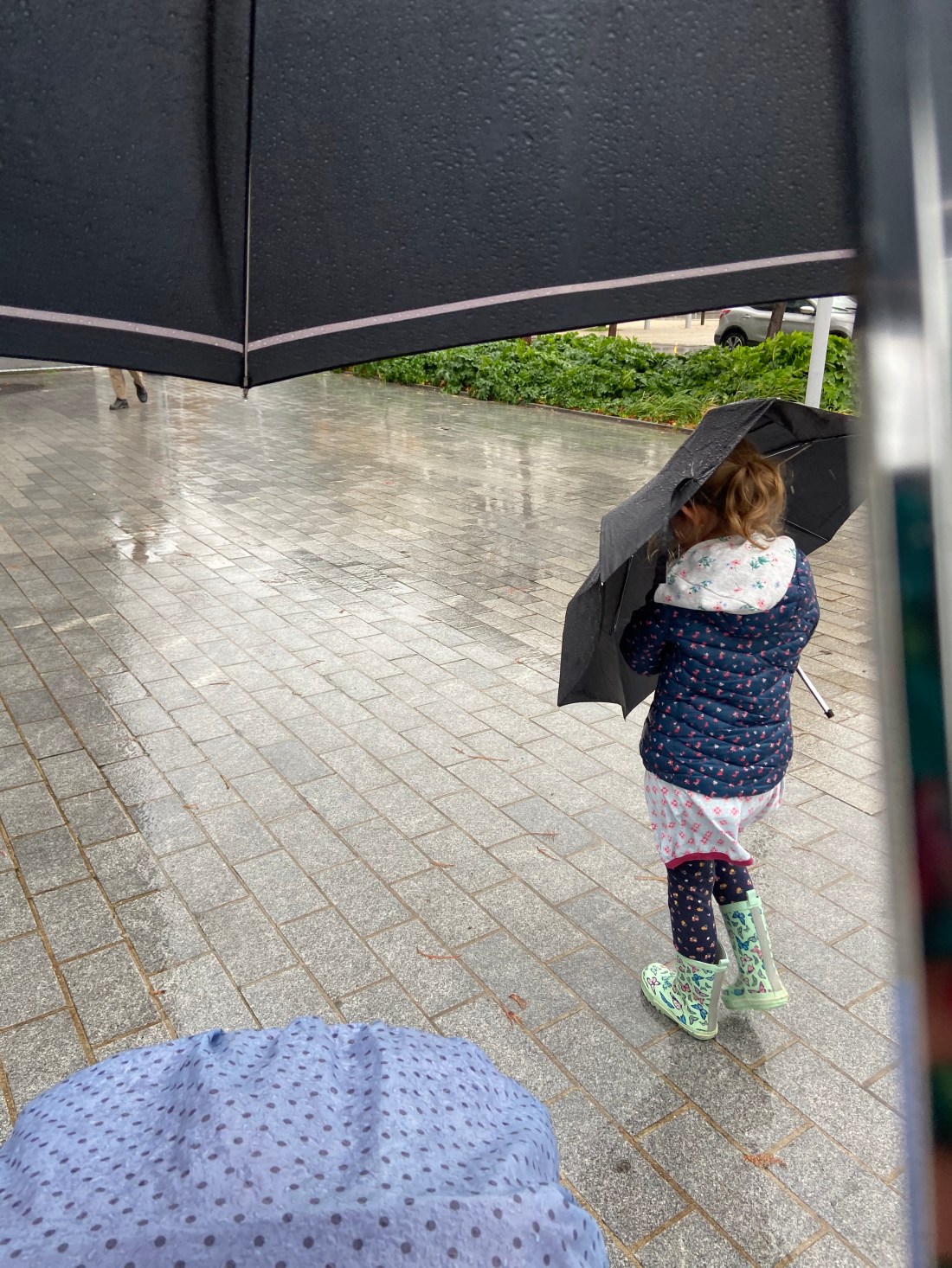 Förmiddagens utetur var 10 minuters trouttinette under taket utanför vårt hus, eftersom vi inte var klädda för ösregnet jag missat innan vi gick ner.