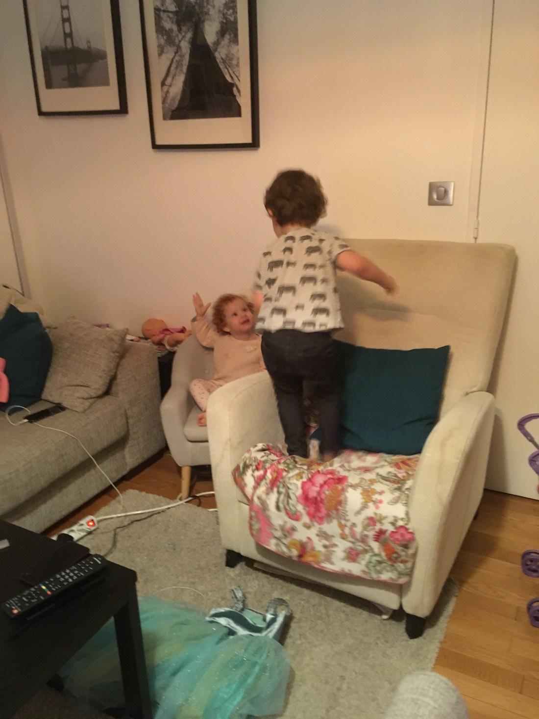 Tomas har varit i Liverpool den här helgen, och vi har alltså fått klara oss på ”tremanhand”. Vädret har lämnat rätt mycket att önska, kallt/regnigt/blåsigt. Jag har tvingat ut så några stunder, men helst vill man ju bara hålla sig inomhus. Fast ändå inte, alla klättrar ju på väggarna efter ett tag. Idag gick vi till lekplatsen en stund på eftermiddagen när regnet tog paus. De första 10 minutrarna sprang Lollo och Sam bara runt runt runt och jagade varandra. Som att det fanns så mycket energi som behövde komma ut😜