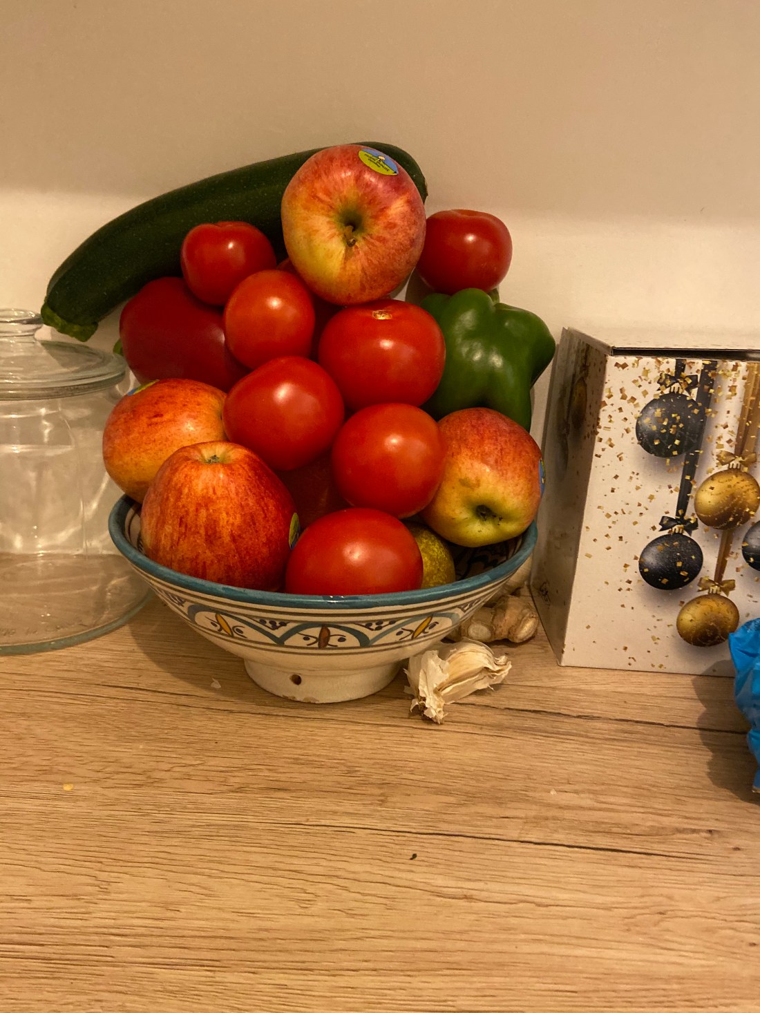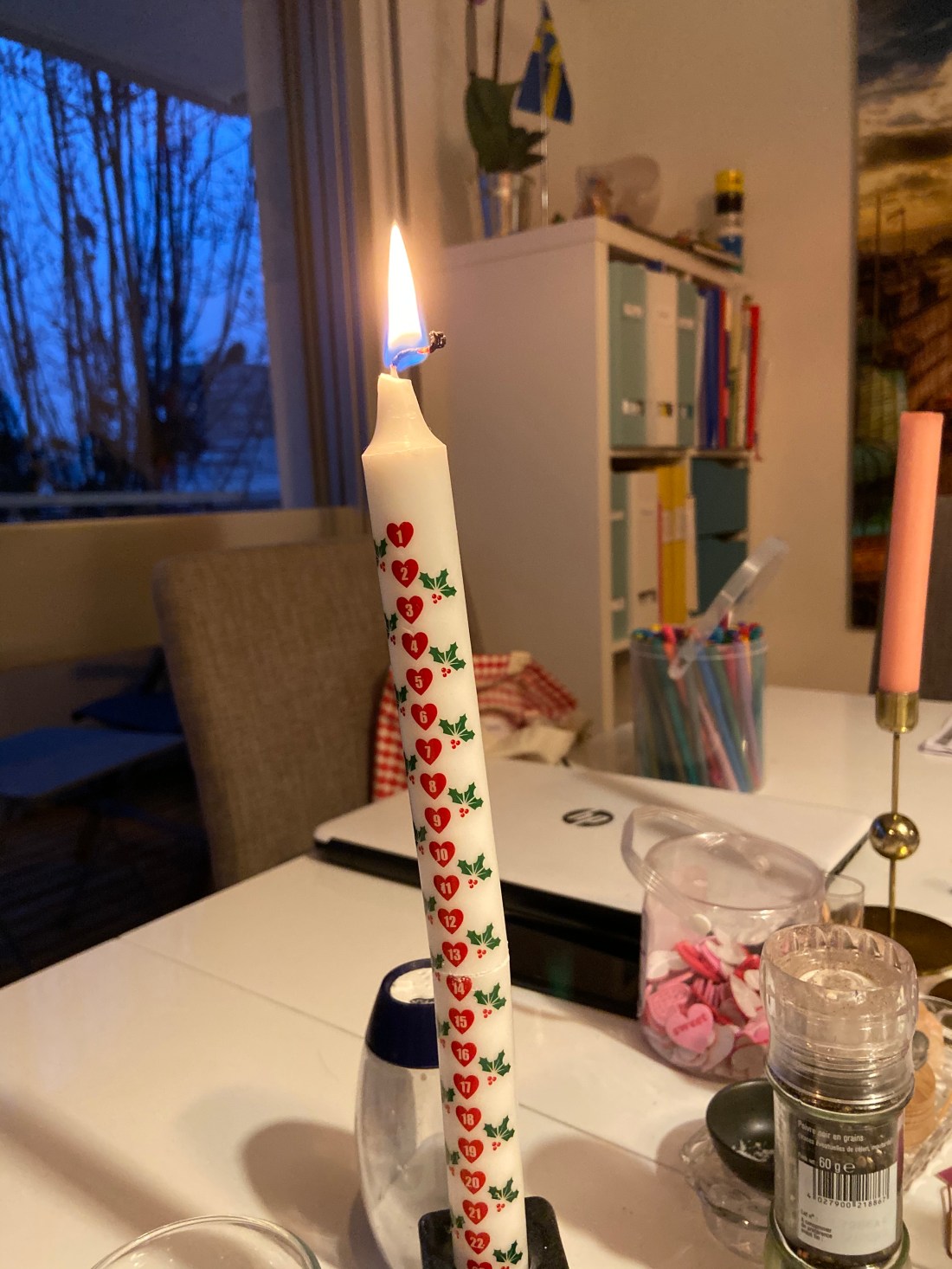 Hon har också tagit sig friheten att pynta lite runt om i lägenheten idag. Lite varstans sitter nu olika färglagda julmotiv. Inte alls en dum idé.
