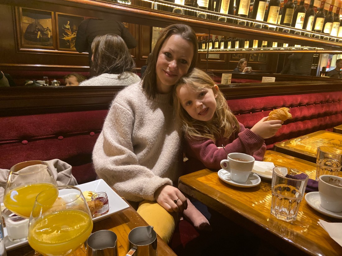 Detta följdes av en andra frukost på ett café i närheten. En klassisk full fransk frukost består av färskpressad apelsinjuice, croissant och en bit rostad baguette med smör och sylt. Och en varm dryck, idag blev det varm choklad till kidsen, men normalt en espresso. Det låter inte så speciellt men när det är bra grejer så är det såå gott.