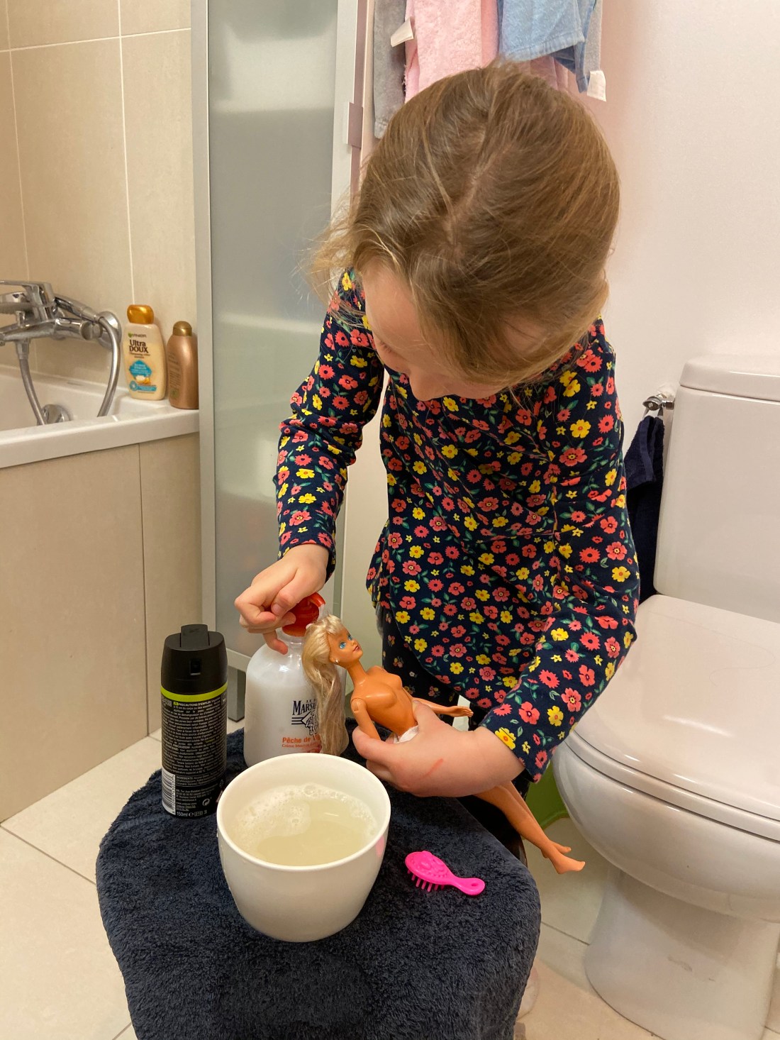Vi måste fortsätta på Lollo-spåret för hon får så roliga idéer. Här på kvällskvisten bestämde hon sig för att ordna en skönhetssalong för sina Barbies. Det plockades fram grejer och sedan gick hon på jakt efter kunder. 4 glada Barbies fick sina hår tvättade och sprutade med parfym💅🏻