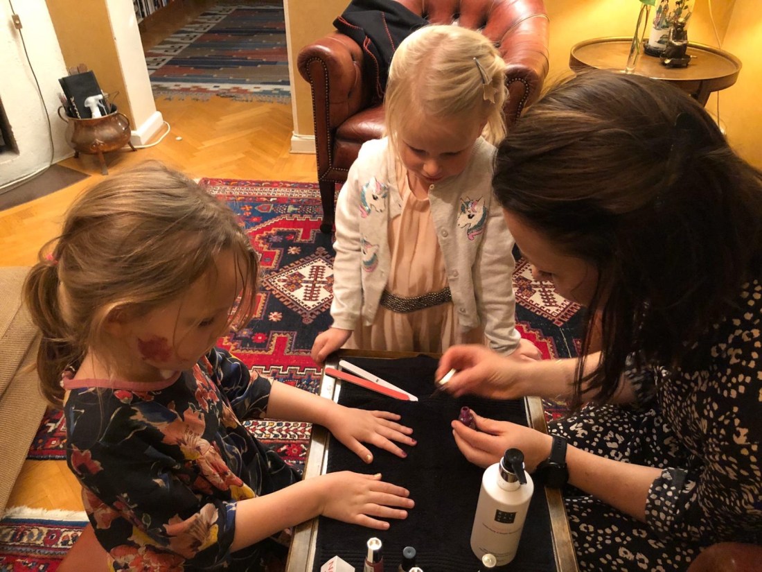 Innan dess spenderade vi en vecka i Sverige, där vi som vanligt försöker hitta en balans mellan att träffa så många som möjligt utan att det blir stressigt. Vi lyckas väl sådär, men det är ju så roligt att hitta på saker. Och ofta har vi en realistisk plan men så dyker det upp saker medan vi är hemma som vi liksom inte kan säga nej till. Som när Lollo helt apropå hittar på att hon vill bjuda in till ”Tjejmys”. En helt färdig idé hade hon – 7 namn på gästlistan och precis vad som skulle göras och ätas. Sedan gick hon raskt vidare och började göra inbjudningskort med hjälp av morfar. Som tur var med allt detta engagemang hittade vi en liten lucka och alla våra härliga vänner ställer upp och levererar myssugna tjejer en söndag kväll😊 och det var väldigt mysigt. Det åts fruktsallad och korvmackor, målades naglar, pysslades och tittades på film. Och mammorna fick stanna kvar så det blev tjejmys även på vuxensidan.