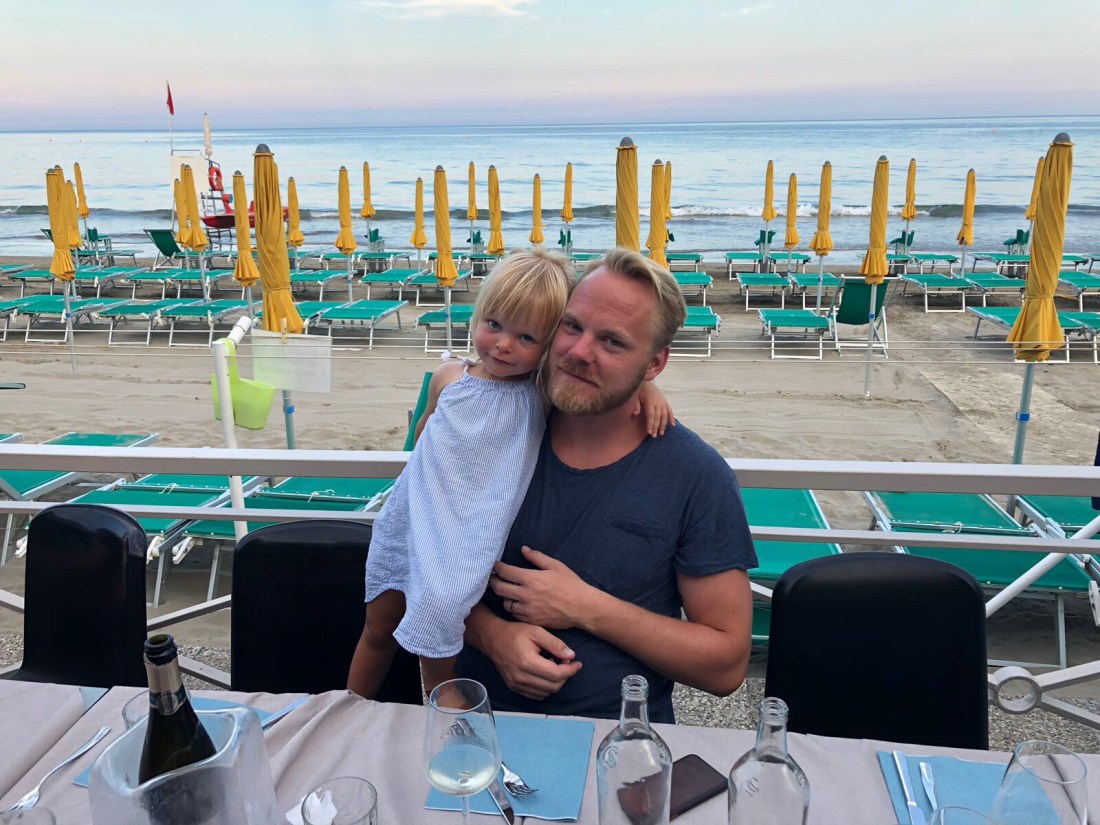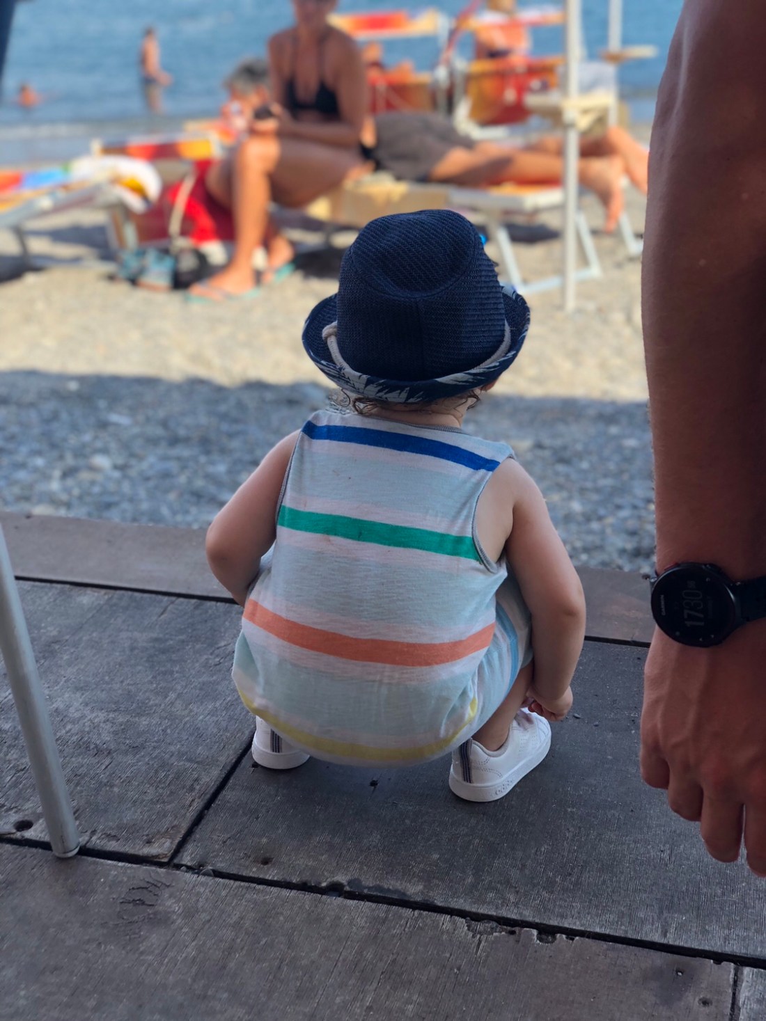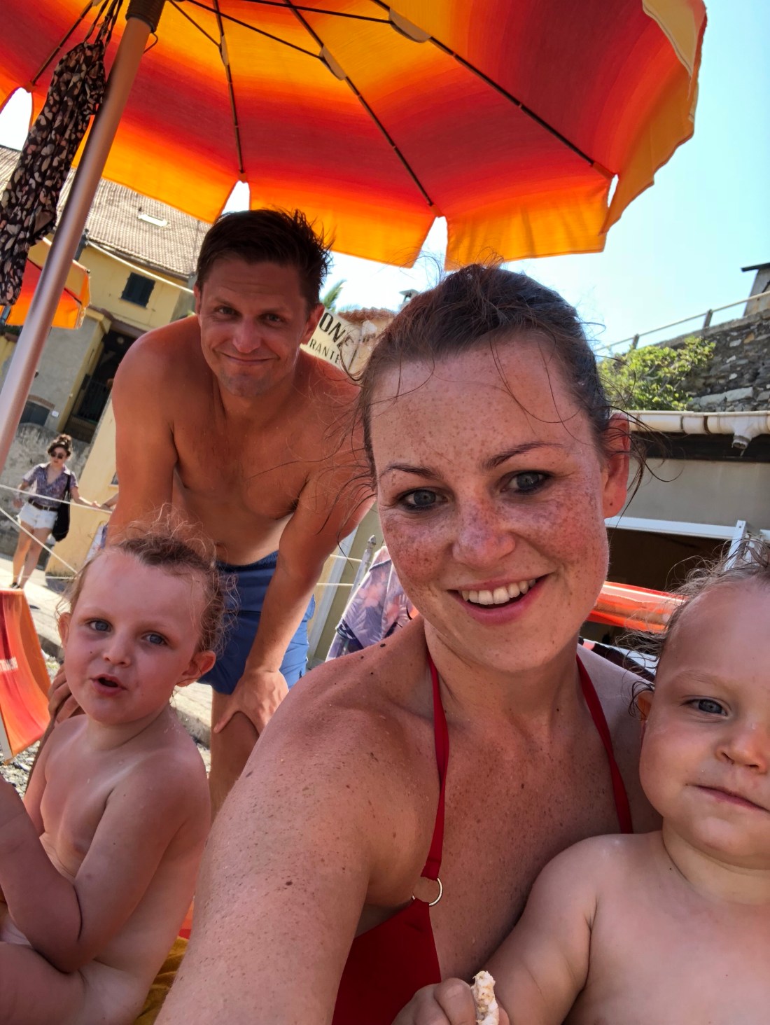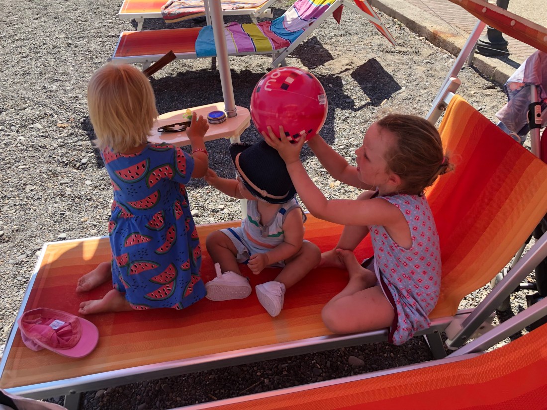 Om någon uppmärksammat att familjen Fischer saknas på bilderna så är det för att det var dags för dem att flyga hemåt igår kväll. Tråkigt att säga hejdå men himla mysigt ni var med👋🏻Innan hemfärden åkte vi allihopa till en av de små kuststäderna västerut, Cervo. Planen att det skulle svalna av på eftermiddagen höll inte helt, men det fanns parasoll och superskönt vatten så det var en bra utflykt. Här var det stenstrand, till skillnad från Alassio. Jag gillar det eftersom man slipper sand överallt. Men lite läskigt när man ska gå i vattnet med Sam eftersom det blir rätt halt istället.