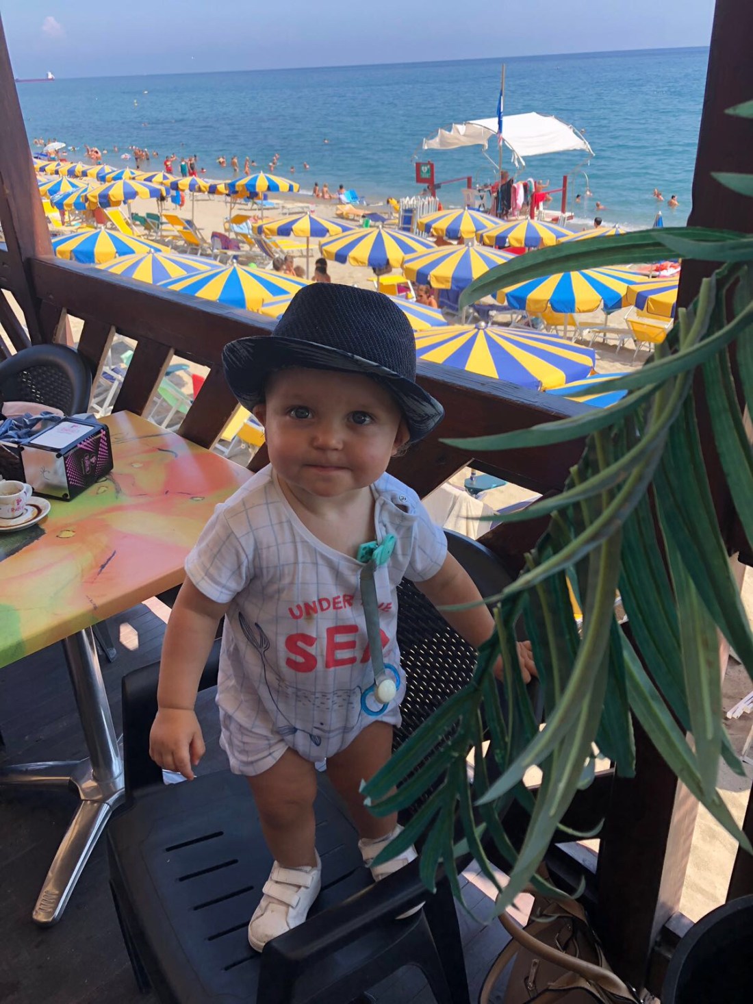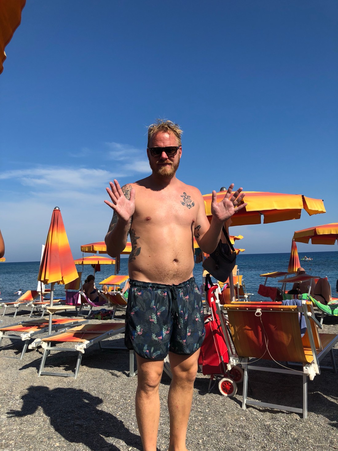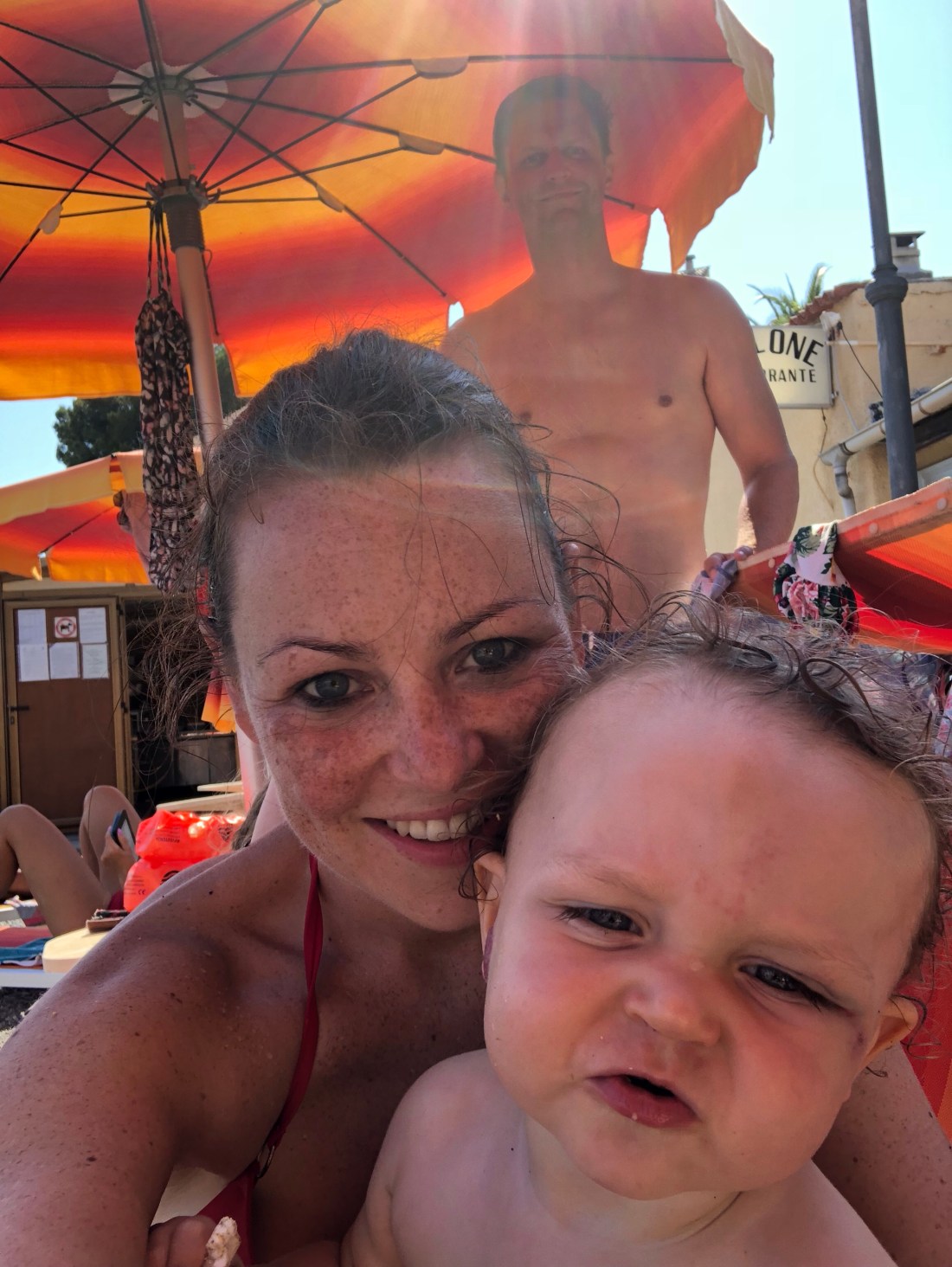 Om någon uppmärksammat att familjen Fischer saknas på bilderna så är det för att det var dags för dem att flyga hemåt igår kväll. Tråkigt att säga hejdå men himla mysigt ni var med👋🏻Innan hemfärden åkte vi allihopa till en av de små kuststäderna västerut, Cervo. Planen att det skulle svalna av på eftermiddagen höll inte helt, men det fanns parasoll och superskönt vatten så det var en bra utflykt. Här var det stenstrand, till skillnad från Alassio. Jag gillar det eftersom man slipper sand överallt. Men lite läskigt när man ska gå i vattnet med Sam eftersom det blir rätt halt istället.