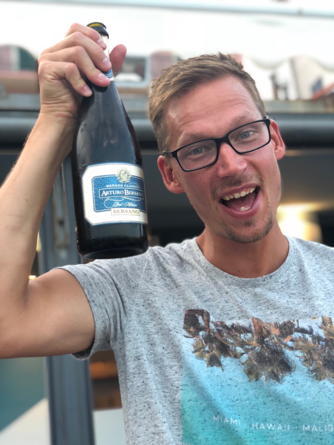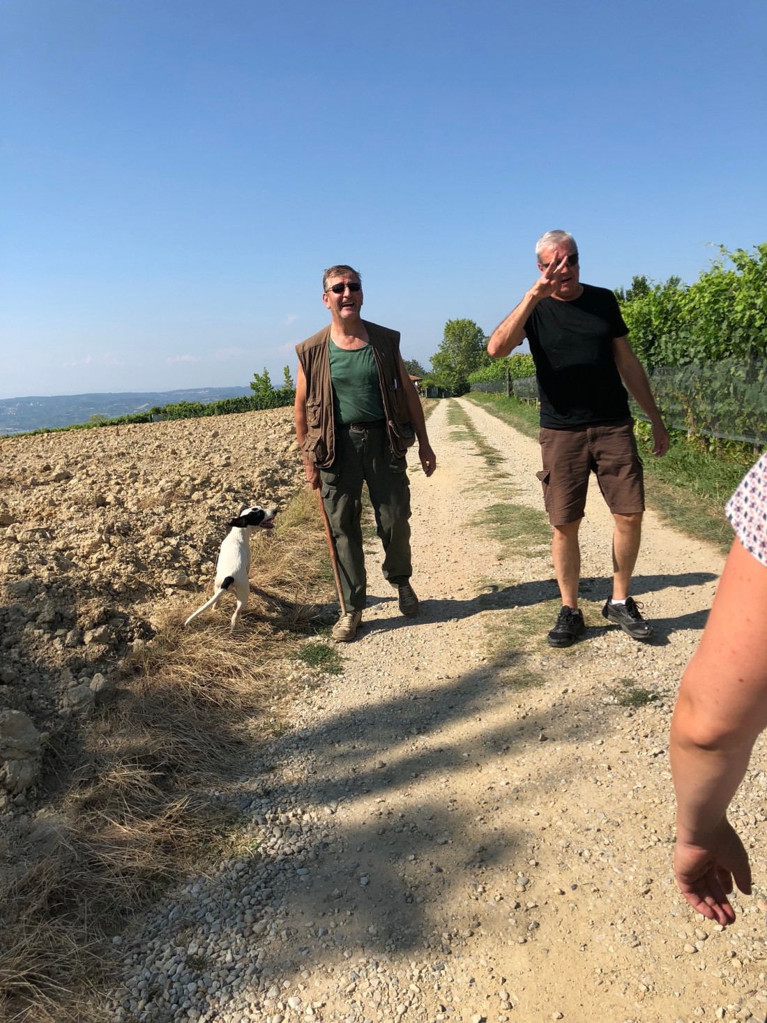 Här sitter vi på höbalar mitt i en vinodling och väntar på att brudparet ska komma ”in”