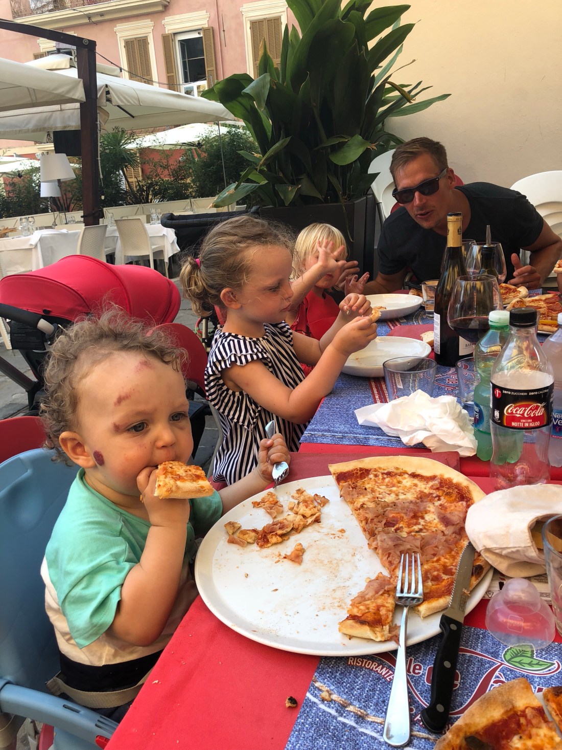Igen, med fokus på barnen, så försökte vi hitta middag vid 6-halv 7. Rätt svårt då de flesta ställen inte öppnade förrän 8. Men vi hittade till slut en pizzeria på en lite större gågata som blev perfekt. Sam älskar visst pizza, ville dock inte äta de fint skurna småbitarna utan helst hela slicar, alternativt plocka ut svampbitarna med gaffel.