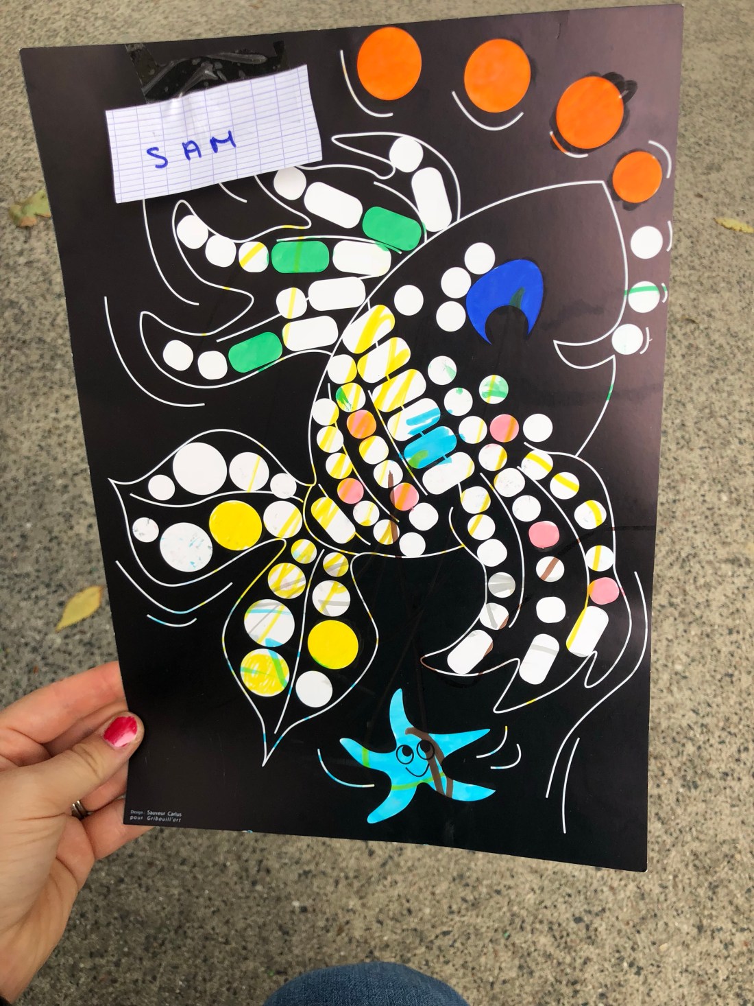 Nu när det är lov så får man hem Lollos arbetsbok med grejer hon gjort under terminen. Verkligen mycket saker de gjort! Mycket bokstäver och siffror, och många olika grafiska mönster ”graphisme”.