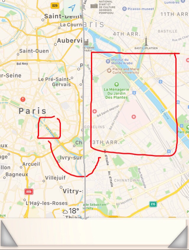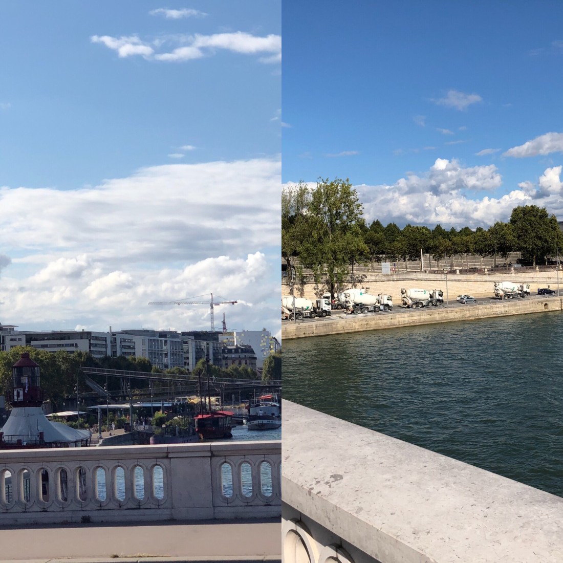Vi hade såklart det jättebra, men detta var första gången man inte var i en mysig del av Paris. Mycket glashus och byggen, järnvägsspår med baksidor, lite industrier på sina platser t o m. Där vi passerade Seine, över Pont de Tolbiac, kändes det lite som stan faktiskt höll på att ta slut. Såhär vyn åt båda hållen på bron