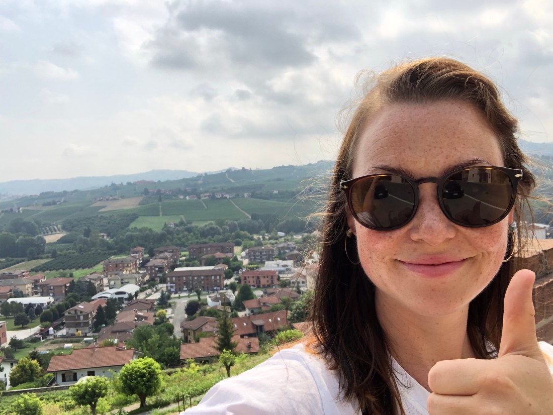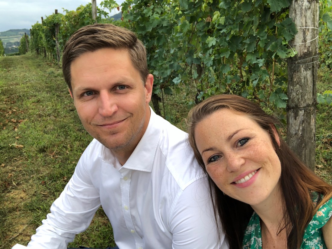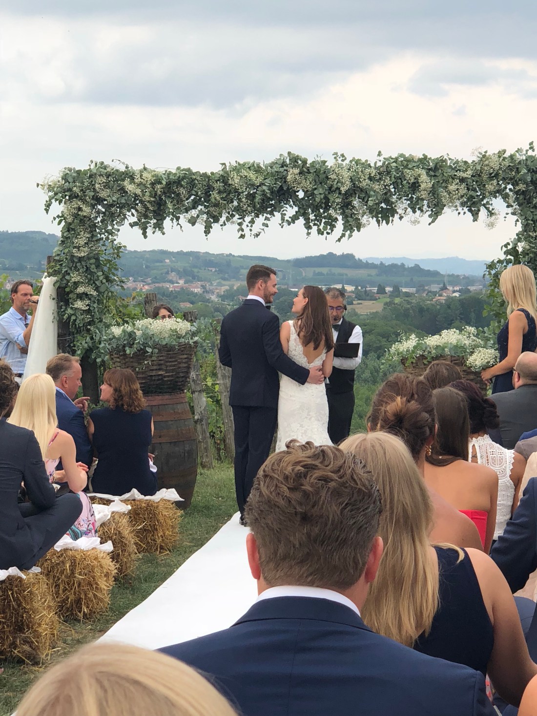 Här sitter vi på höbalar mitt i en vinodling och väntar på att brudparet ska komma ”in”