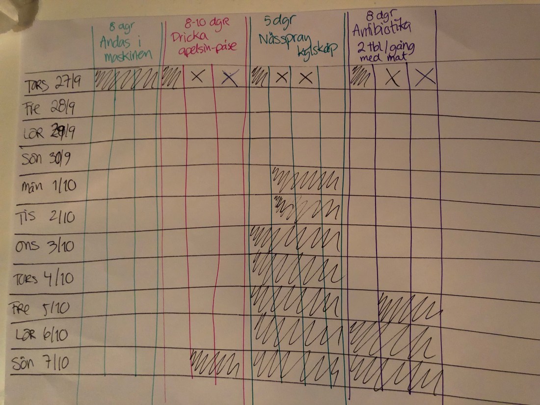 För egen del har jag en riktigt seg bihåleinflammation som nu blivit skannad, och förhoppningsvis snart är botad. Hela sjukvårdssystemet här är ju väldigt annorlunda, med klara för- och nackdelar jämfört med Sverige. Har aldrig haft just bihåleinflammation i Sverige så jag vet inte hur man behandlar. Men jag tycker det är fantastiskt att man här kan boka en tid med en specialist samma dag eller dagen efter, efter eget beslut. Jag träffade en allmänläkare för två veckor sedan, som gav mig en antibiotikakur, som dock inte hjälpt. Igår träffade jag en öron/näsa/halsläkare som skrev en remiss till en skanning, som jag iofs själv fick boka, men som gjordes samma dag på en klinik nära oss. Idag ÖNH igen och en hel drös med åtgärder. Fick göra ett litet schema till mig själv för att hålla rätt på det😜 4 olika mediciner/grejer som ska göras, med olika intervaller, och olika många dagar🤯 Det känns som overkill, men jag gillar känslan av att bli tagen på allvar när man mår dåligt, och att alla medel sätts in för att det ska bli bra.
