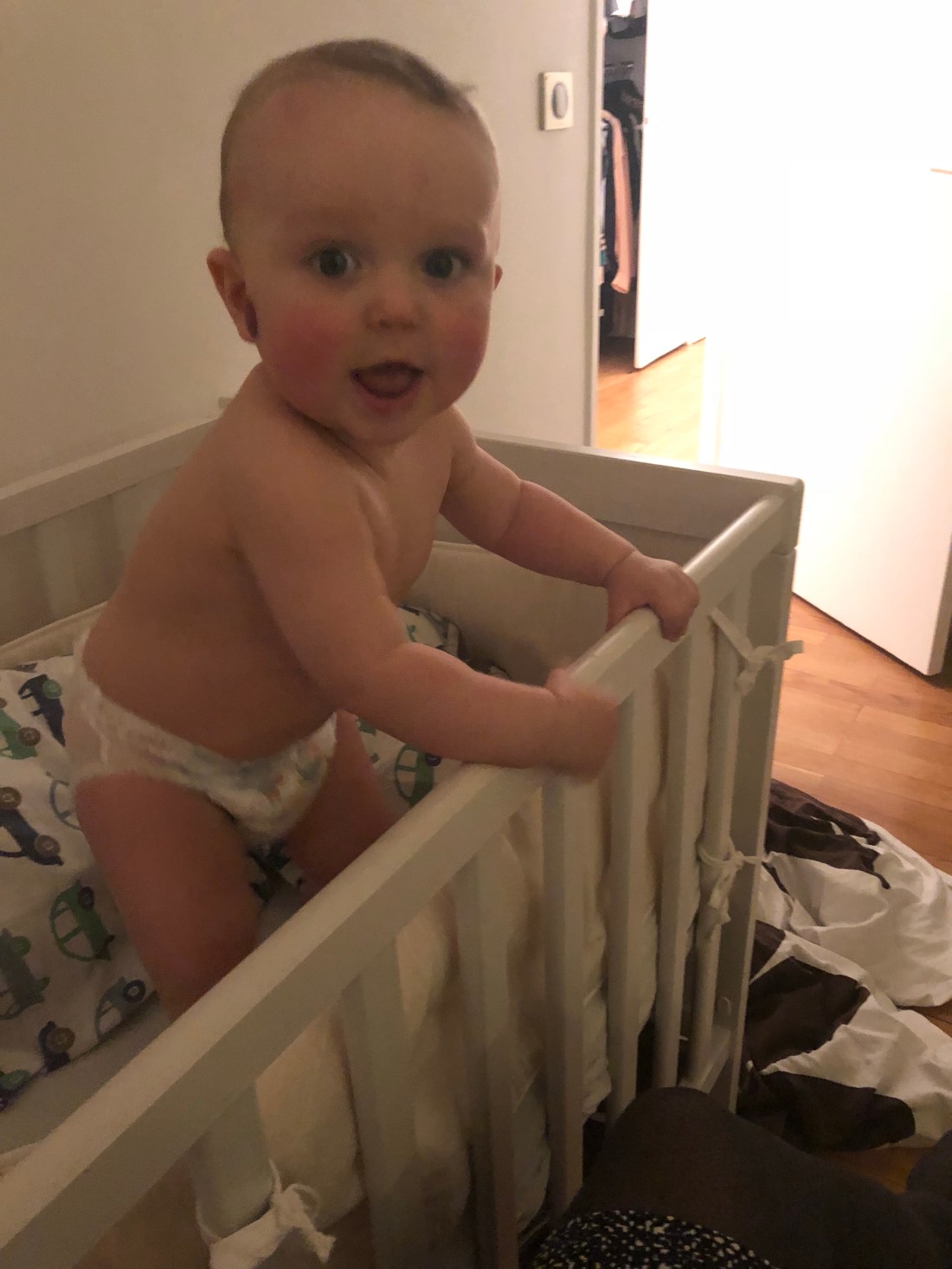 Stor dag för Sam som har fått flytta ner till botten i sin spjälsäng efter att ha lyckats med detta från liggande