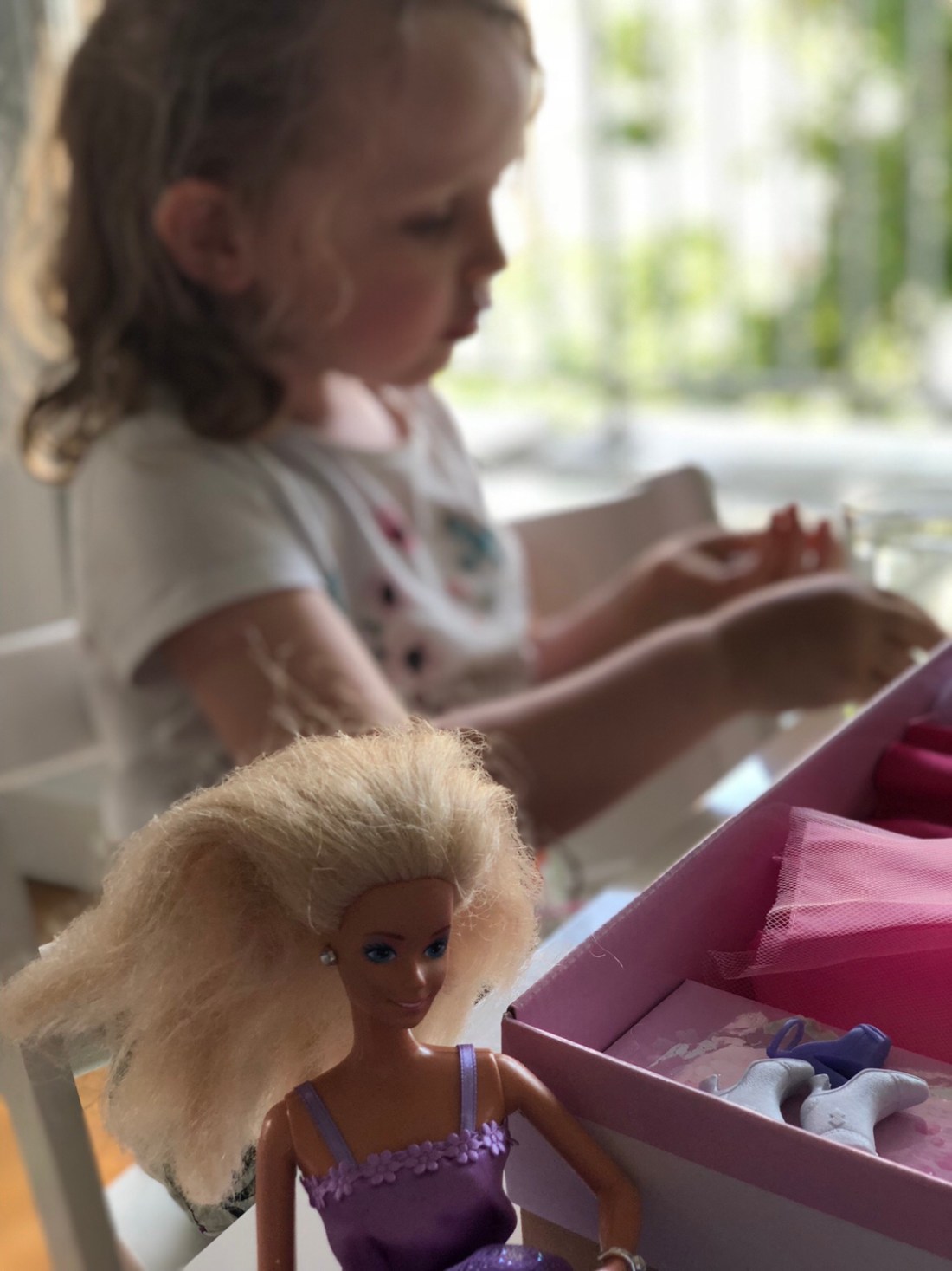 Sedan har det varit mycket lek med Lollos nya leksaker, bland skola med staffliet (lillebror gör oftast INTE som fröken Lovisa säger😅). Och så på- och avklädnad på Barbies i alla oändlighet.