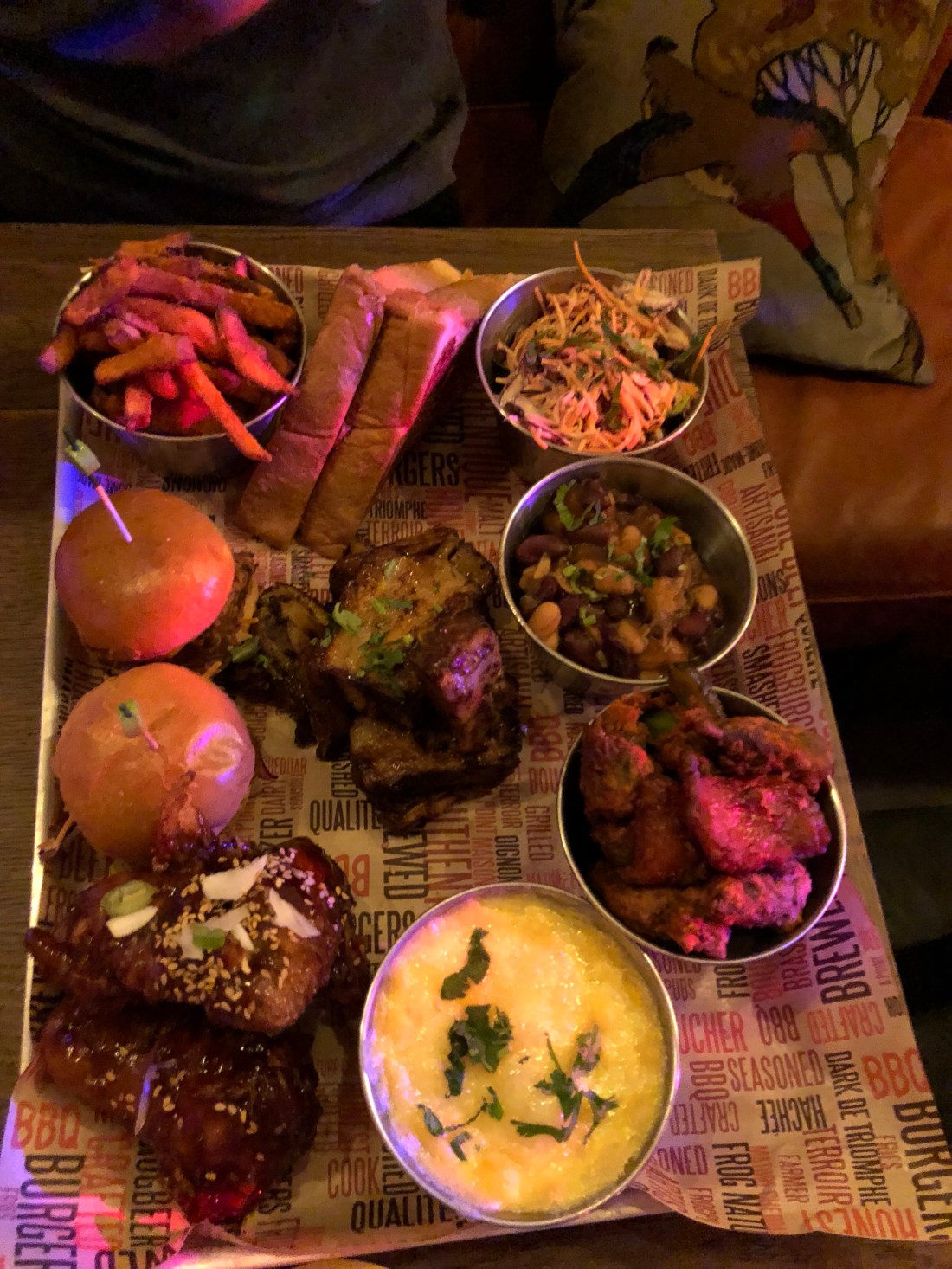 Efter utställningen blev det lite strosande och sedan såklart middag. På ett väldigt otippat ställe – The Frog&Underground. Ett rätt stökigt ställe men med bra energi och där det ändå gick att prata. Maten kändes väldigt amerikansk men de kallar sig själva pub och kändes nog som de var rätt brittiskinspirerade. Vi tog in en bricka med allt möjligt att dela på👌🏻