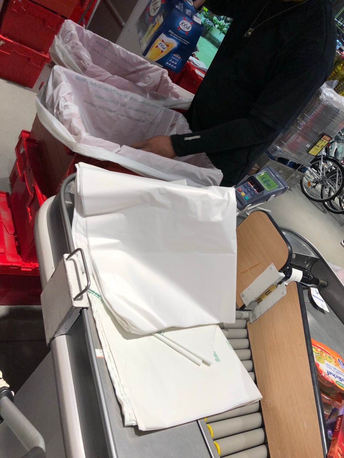 I Sverige körde vi en del e-handel av mat och det tyckte jag ofta var smidigt, där var det tiden som var den stora grejen. Här har jag mycket tid, och tycker det är kul att handla mat. Men måste planera så att jag inte köper för mycket tungt eller stort samtidigt…tills idag när jag provade lokala butikens hemleverans🙌🏻 Funkade hur bra som helst! Tydligen en lösning som traditionellt alltid funnits i Frankrike. Man plockar alltså ihop sina grejer och går till en speciell kassa där någon står redo att packa ner allting i plastlådor med påsar i. Man betalar som vanligt, lämnar sin adress (eller drar sitt lojalitetskort om man har det) och så kommer de inom 3h och levererar. En väldigt bra lösning just nu!