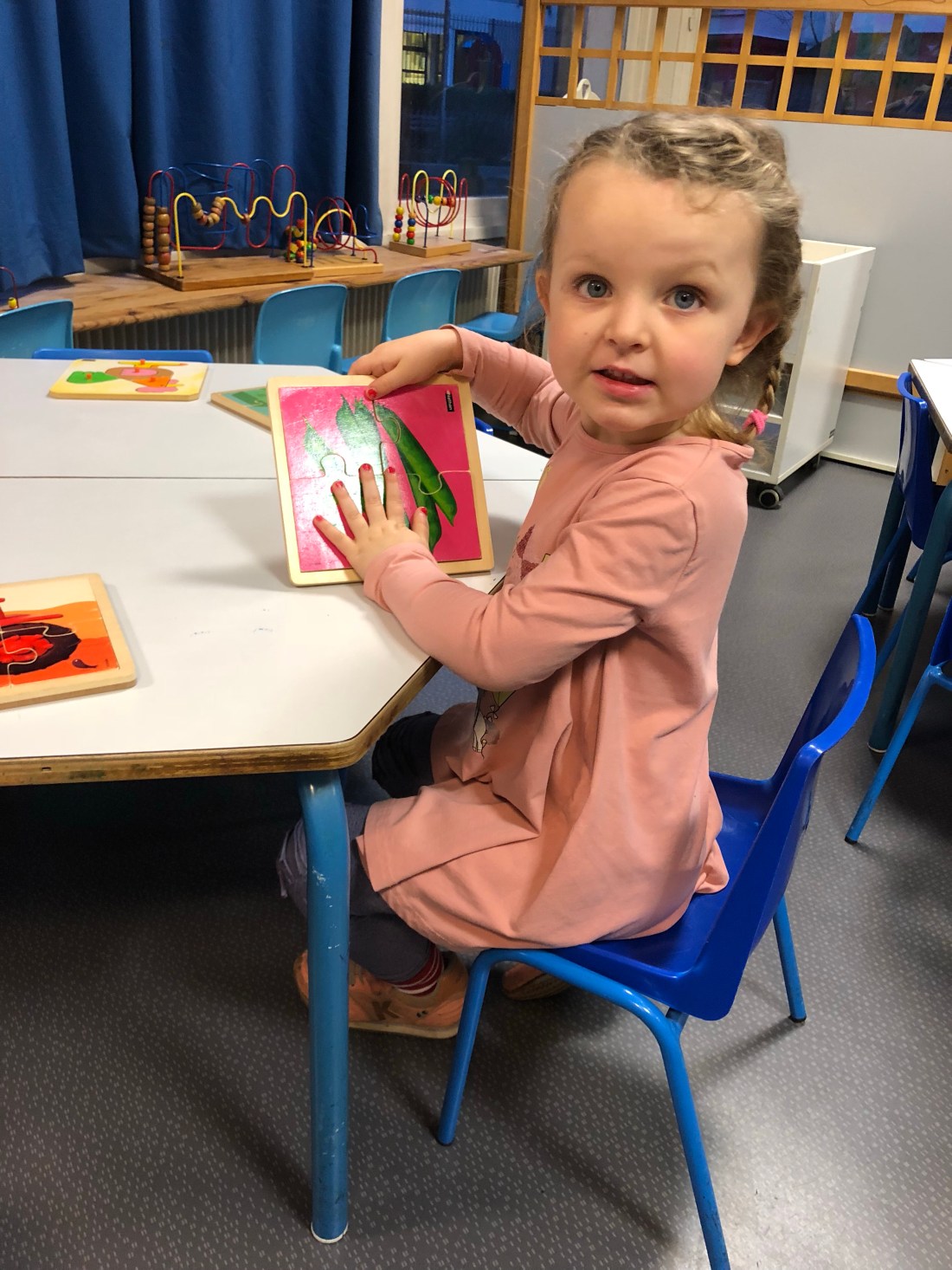 När man kommer på morgonen så finns det uppdukat olika aktiviter vid olika bord (t ex pussel eller pennor/papper) så slår man sig ned med sitt barn och hjälper dem igång en stund.
