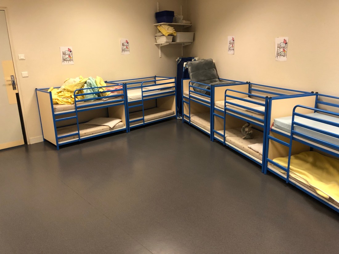 Såhär det sovsalen ut, plats för hela klassen på 22 barn. Nu höll de på att byta lakan men annars är det fint bäddat och alla barn har sin egen säng.