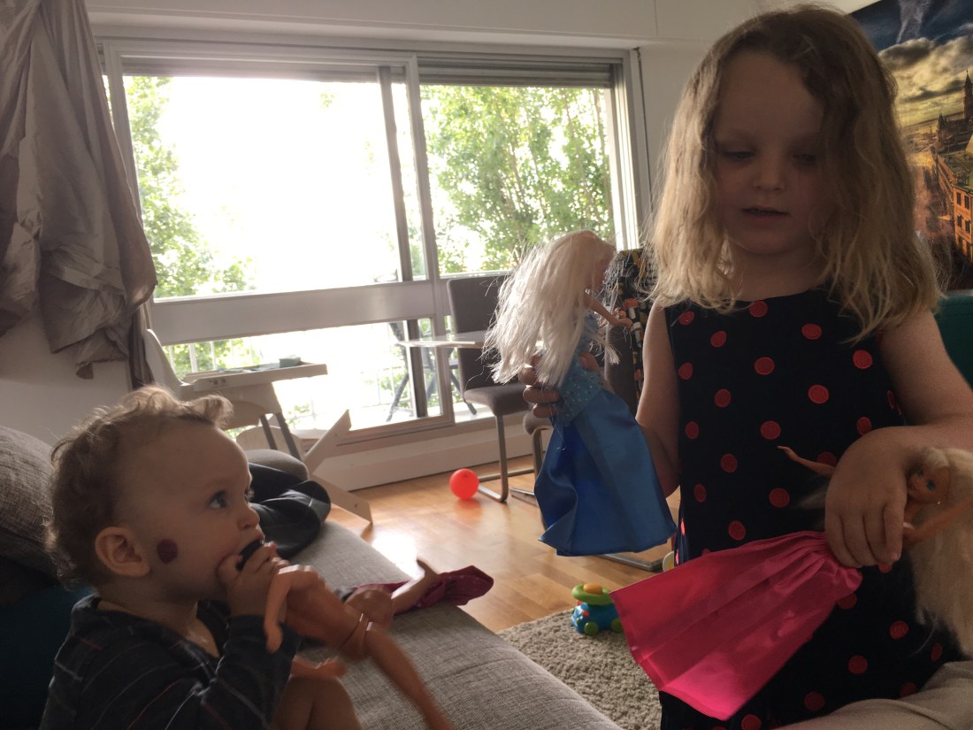 Lollo kör hårt med sina Barbiedockor nu. När hon ska sova på maternelle så vill hon ha med sina nya Barbie (tack Elsa😊) istället för ett gosedjur som de andra barnen. Mest handlar det om att klä av och på dockorna med de nya kläderna (tack farfar👌🏻). Igår kom hon på att det var synd om Ken som inte passar i någon av klänningarna, så vi har bestämt att vi ska sy något till honom🙋🏻♀️😁 Ken har inte heller något hår så när Sam får vara med och leka är det Ken han får han. Förutom den nya dockan är det här mina gamla Barbies. Så himla bra att de kommer till användning👍🏻